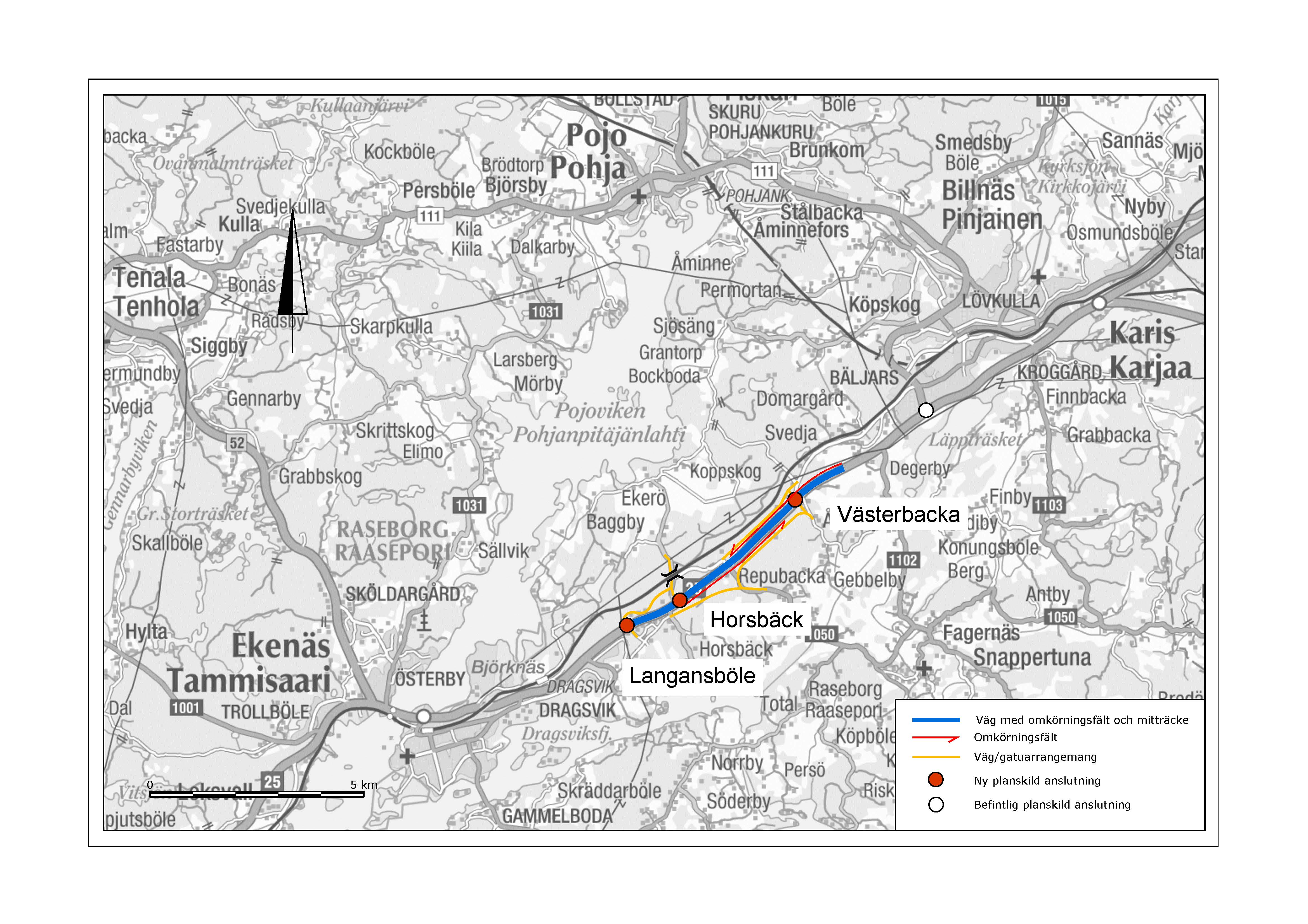 Planeringsområdet omfattar ett cirka 7 kilometer långt område mellan Langansböle och Västerbacka. De nuvarande plankorsningarna avlägsnas och ersätts med tre planskilda anslutningar. Dessutom planeras omkörningsfiler med mitträcke och nödvändiga grundvatten- och bullerskydd. Till planen hör också att avlägsna Raseborgs plankorsning och bygga en underfartsbro för den nya banan.