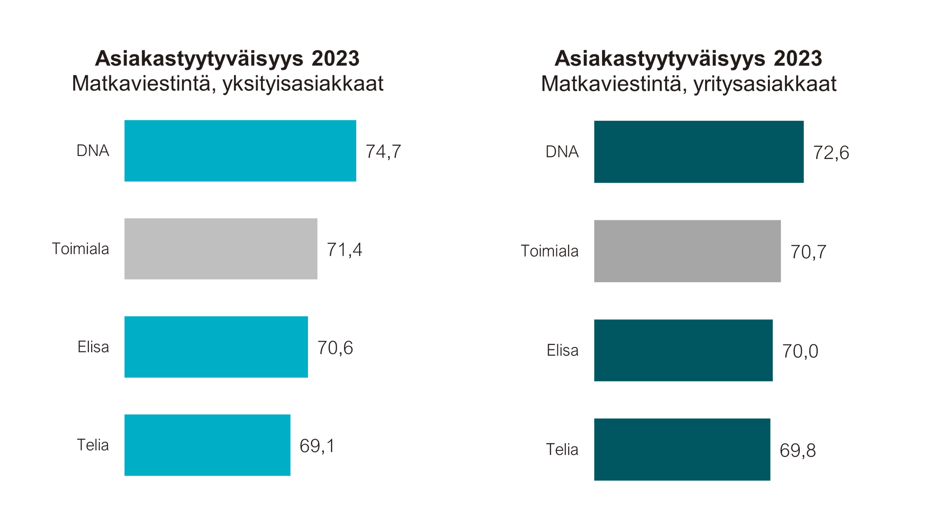 The study showed an overall decrease in mobile consumer satisfaction, with the industry average falling from 74.4 to 71.4. DNA’s performance was more stable than that of other operators, falling only slightly from 75.7 to 74.7. In contrast, the industry average for corporate customer satisfaction rose from 69.8 to 70.7. Here, DNA achieved an above-average upward trend, raising its performance from 69.5 to 72.6.