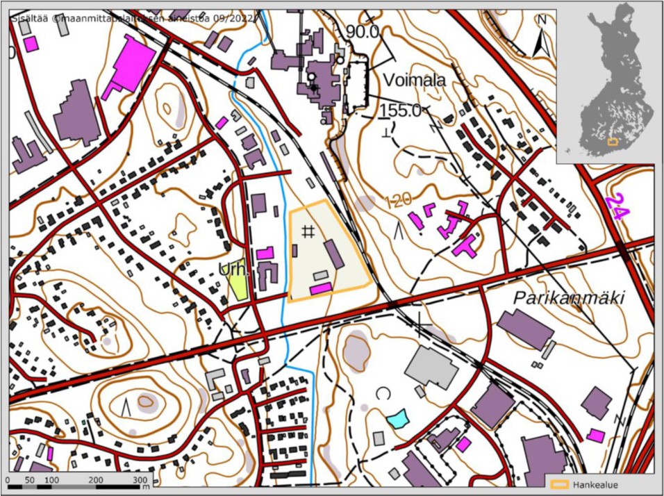 Hankkeen sijaintipaikka on Lahdessa Kymijärven voimalaitoksen välittömässä läheisyydessä. Hankealue on esitetty oranssilla rajauksella. Lähde: YVA-ohjelma, Nordic Ren-Gas Oy.