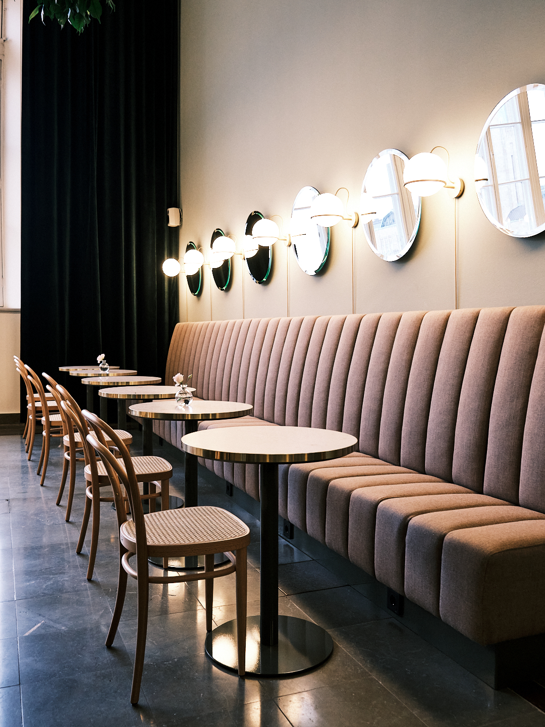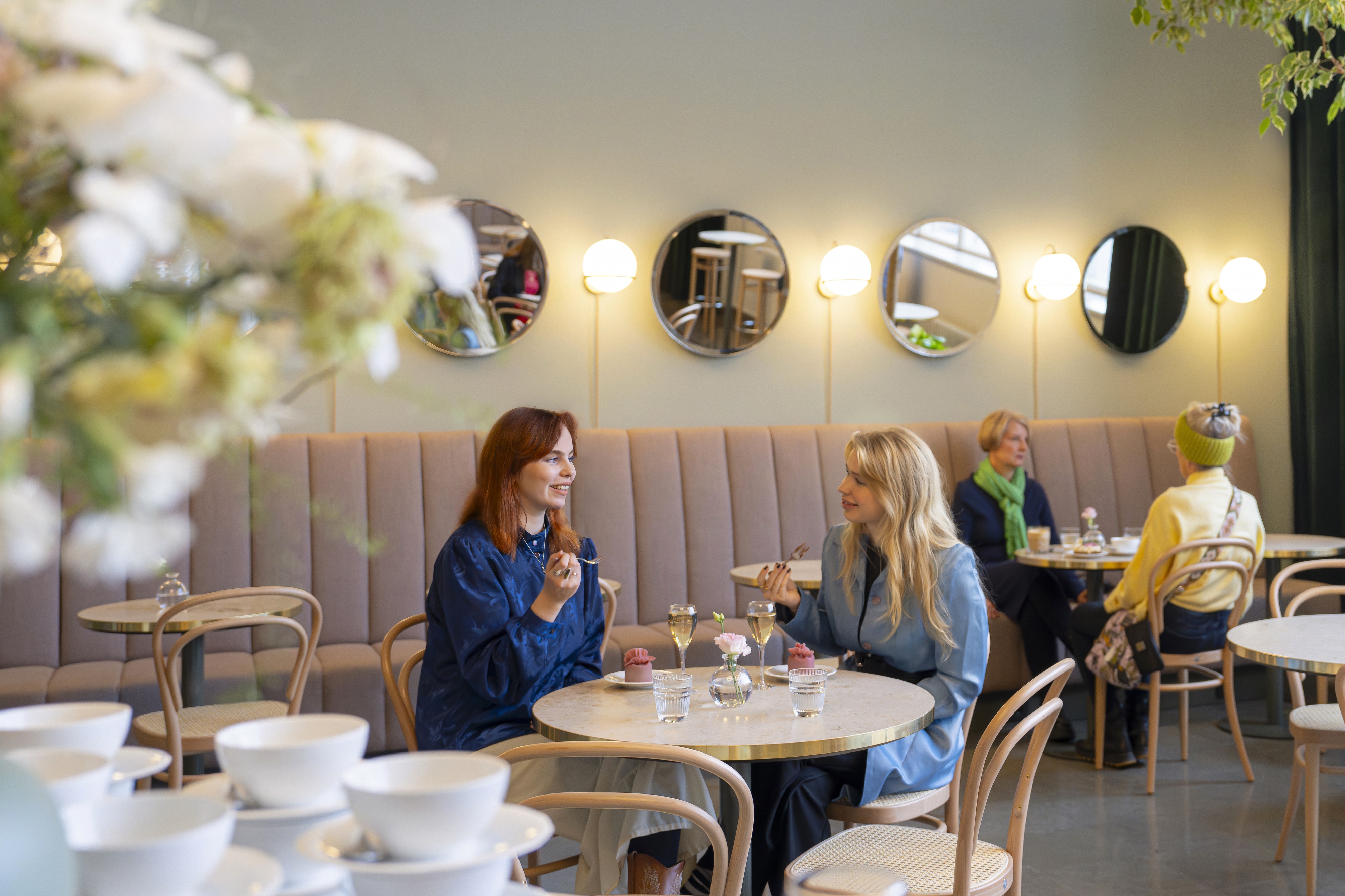 “The high space is dominated by the beautiful green limestone floor and a huge arched window that overlooks the Railway Square. The large chandeliers and the wall lights that line the room, as well as the harmonious colour scheme, create a warm and peaceful atmosphere in the café. The long sofas and classic chairs invite you to sit down, and you can even spot gastropod fossils in the limestone tabletops. All this provides a great setting for a classic café”, says Päivi Meuronen, of JKMM Architects, who was responsible for the Café Höijer design.