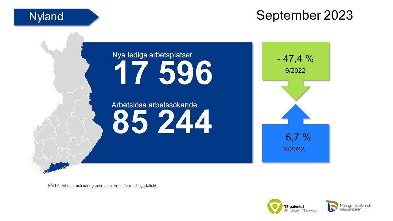 I slutet av september var antalet arbetslösa arbetssökande i Nyland sammanlagt 85 244, varav 80 834 var utan anställning och 4 410 permitterade. Jämfört med året innan ökade antalet personer utan anställning med 3 595 personer (4,7 %) och antalet permitterade ökade med 1 732 personer (64,7 %). I hela landet ökade antalet arbetslösa utan anställning med 3,9 % och antalet permitterade med 87,6 % jämfört med föregående år.