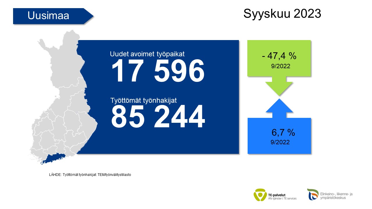 Uusia avoimia työpaikkoja ilmoitettiin Uudenmaan TE-toimistoon syyskuussa 17 594, mikä on 47,4 % vähemmän kuin vuosi sitten. Koko maan tasolla vuosimuutos oli -36,4 %.