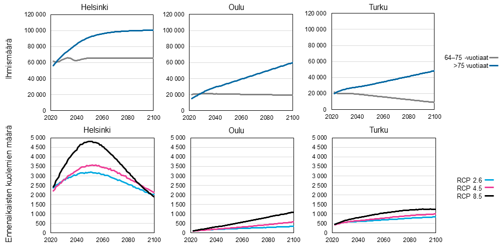 Vanhimmat ikäluokat (yli 65-vuotiaat) ovat alttiita ilmastonmuutoksen aiheuttamille terveysriskeille. Kuumuuteen liittyvän ylimääräisen kuolleisuuden on arvioitu lisääntyvän Suomessa 1–4 prosenttia vuosisadan loppuun mennessä, jos ilmastonmuutoksen hillintä epäonnistuu ja globaali keskilämpötila nousee 2–4 astetta. Ilmastopaneelin tuoreessa raportissa analysoidaan sopeutumatta jättämisen kustannuksia, kun Suomen väestö ikääntyy. Helsingissä ennenaikaisten kuolemien määrä nousee huippuunsa vuonna 2050, kun taas Turussa ja Oulussa huippu on vuosisadan lopussa.