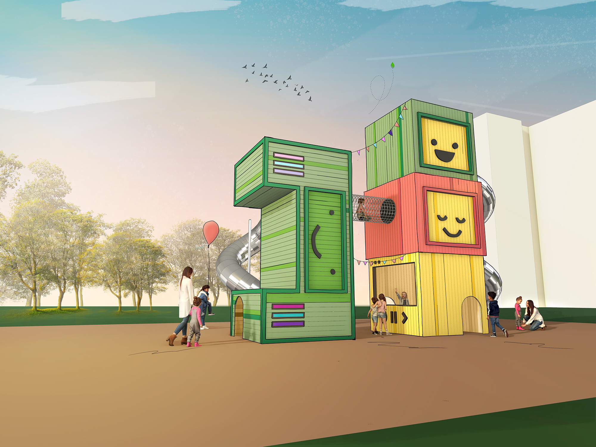 The main play equipment will be a two-part tower that depicts a computer processor. Smaller children can play with computer-themed spring swings and a sandbox shaped like a gaming controller.