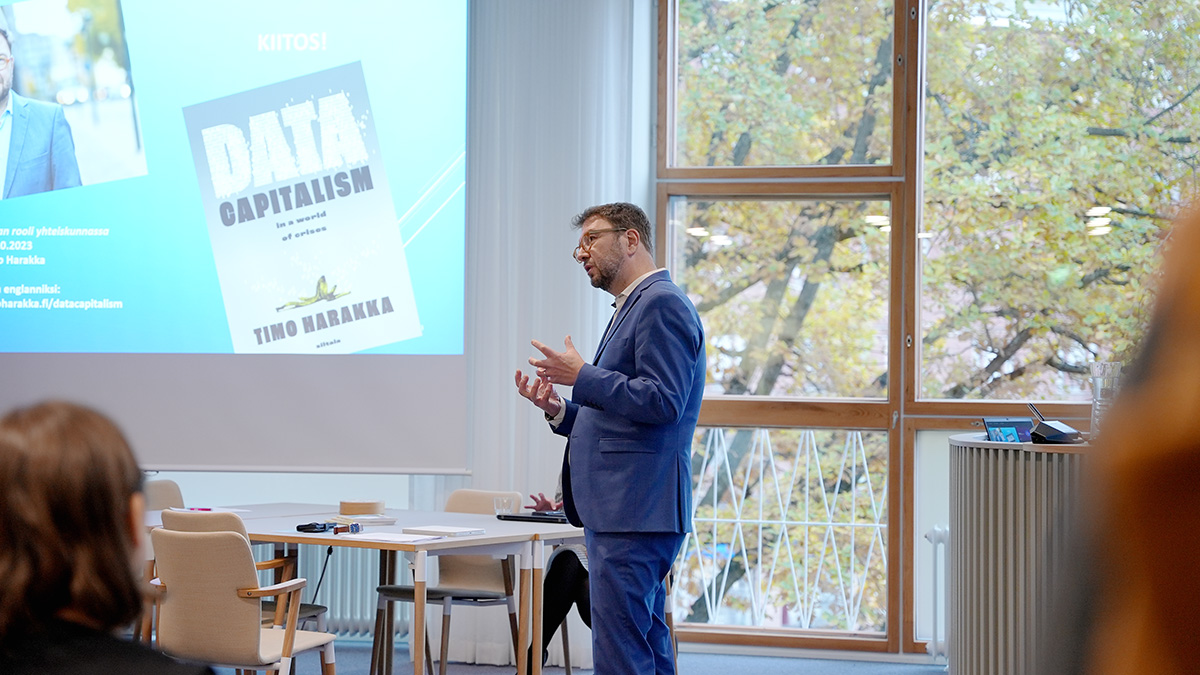 Julkistustilaisuudessa kansanedustaja, tietokirjailija ja toimittaja Timo Harakka puhui datan keskeisestä roolista niin suomalaisessa ja eurooppalaisessa yhteiskunnassa kuin maailmanlaajuisesti. Sanna Marinin hallituksessa tietoliikenne- ja viestintäministerinä toiminut Harakka on kirjoittanut Datakapitalismi kriisien maailmassa -tietokirjan.