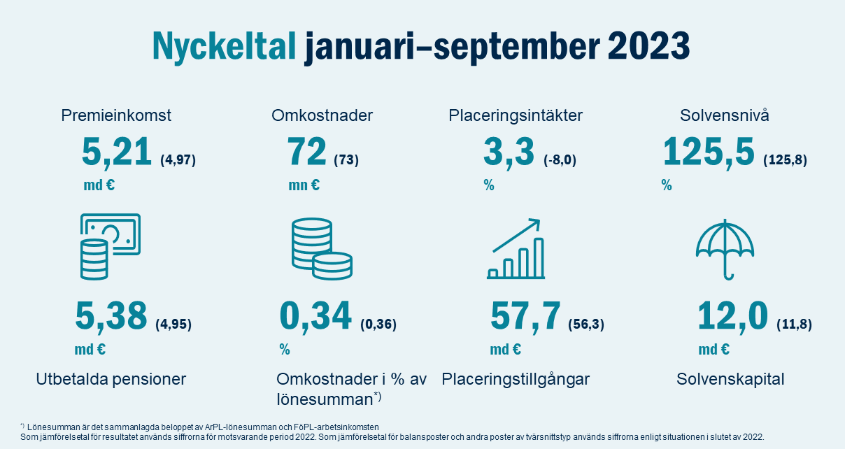 - Premieinkomsten ökade med 5 procent till 5,2 (5,0) miljarder euro. Pensioner utbetalades för 5,4 (5,0) miljarder euro.