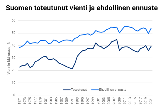 Muun muassa bruttokansantuotteen, maatalousvaltaisuuden, investointiasteen ja väestömäärän huomioivan tilastollisen mallin perusteella Suomen viennin bkt-osuus on matalampi, kuin muissa samankaltaisissa maissa.