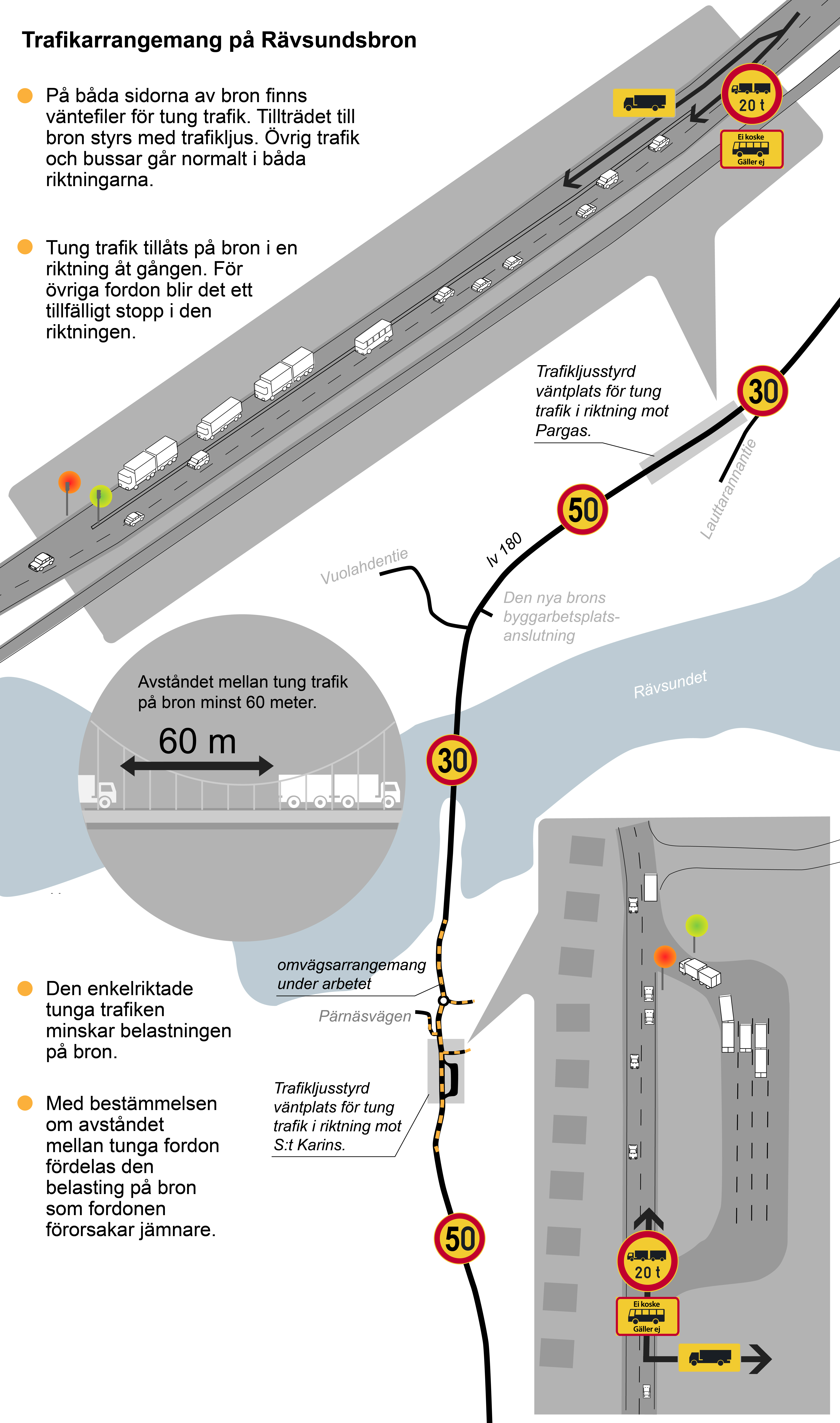 Belastningen från den tunga trafiken måste minskas för att vi ska kunna säkerställa en säker användning av bron tills den nya bron är färdig. Viktbegränsningar för den tunga trafiken skulle orsaka betydande olägenheter för näringslivet i området. Därför har man sökt alternativa sätt att minska belastningen på bron. Som tilläggsbegränsning har planerats en lösning som grundar sig på att den tunga trafiken skulle vara enkelriktad. Genom att den tunga trafiken blir enkelriktad kan belastningen minskas avsevärt, eftersom tunga fordon som kör i olika riktningar inte möts på bron. En lösning som grundar sig på enkelriktad tung trafik är innovativ och har inte använts tidigare i Finland eller de övriga nordiska länderna. Trafikens smidighet och behovet av dimensionering av väntområdena för tung trafik har utretts genom simuleringar, men på förhand kan man inte med full säkerhet veta hur trafiken kommer löpa i praktiken. Även planeringen av lösningen har varit förknippad med utmaningar: utrymmet är litet, markens bottenförhållanden har varit utmanande och anslutningarnas funktion måste tryggas. Planerna är nu i huvudsak klara och byggandet av väntområden för tung trafik inleds i november under veckorna 45–46.