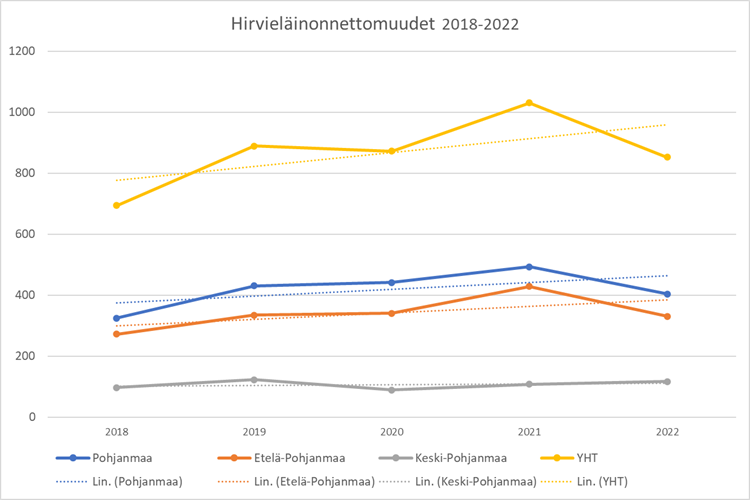 På NTM-centralen i Södra Österbottens område sker det årligen väldigt många olyckor som inkluderar älgar och hjortar. Under femårsperioden 2018–2022 har antalet hjortdjursolyckor ökat med 23 %. Det positiva är att samtidigt har antalet hjortdjursolyckor som lett till personskador minskat med 22 %. Skillnaden beror på att antalet olyckor som involverar rådjur och skogsren kraftigt har ökat. Olyckor med rådjur orsakar i allmänhet inte personskador eftersom djuren är små till storleken. Olyckor med skogsren orsakar trots ökningen endast ca 5 % av områdets hjortdjursolyckor. Den årliga variationen i antalet olyckor som involverar djur är stor och hjortdjursbeståndets storlek har en betydande inverkan.