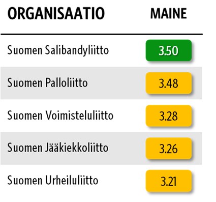 Tutkittujen lajiliittojen maine liikkuu hyvän ja kohtalaisen välillä. Hyvämaineisin liitto on viimevuotiseen tapaan Salibandyliitto (3.50).