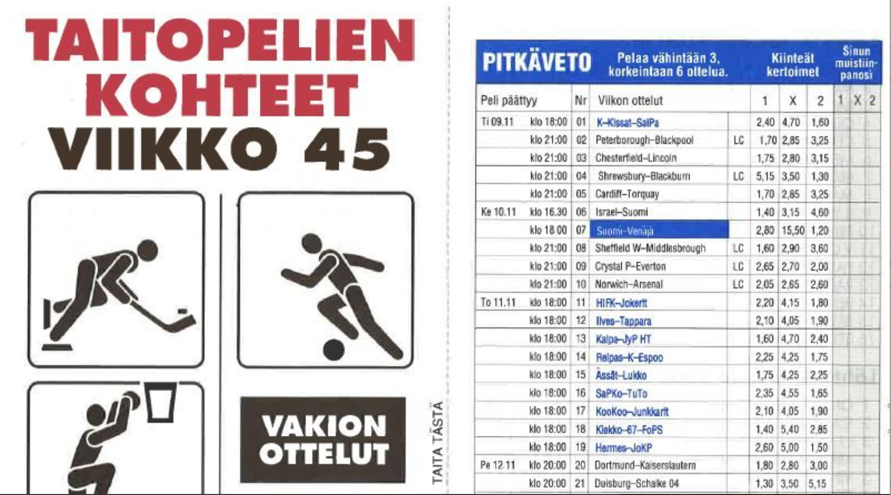 Veikkauksen vedonlyönti 30 vuotta: Pitkävedon ensimmäinen kohde pelattiin 9.11.1993