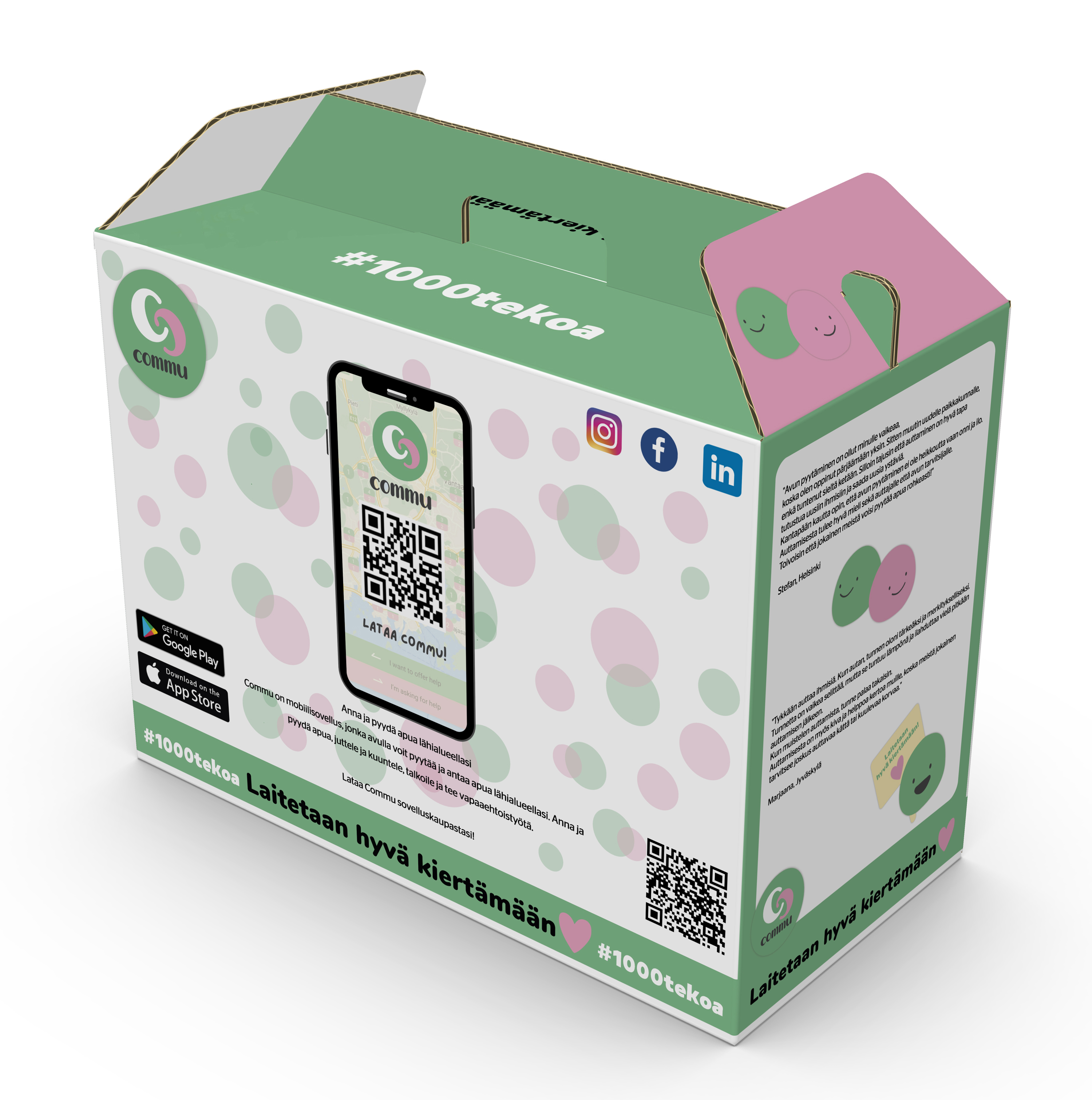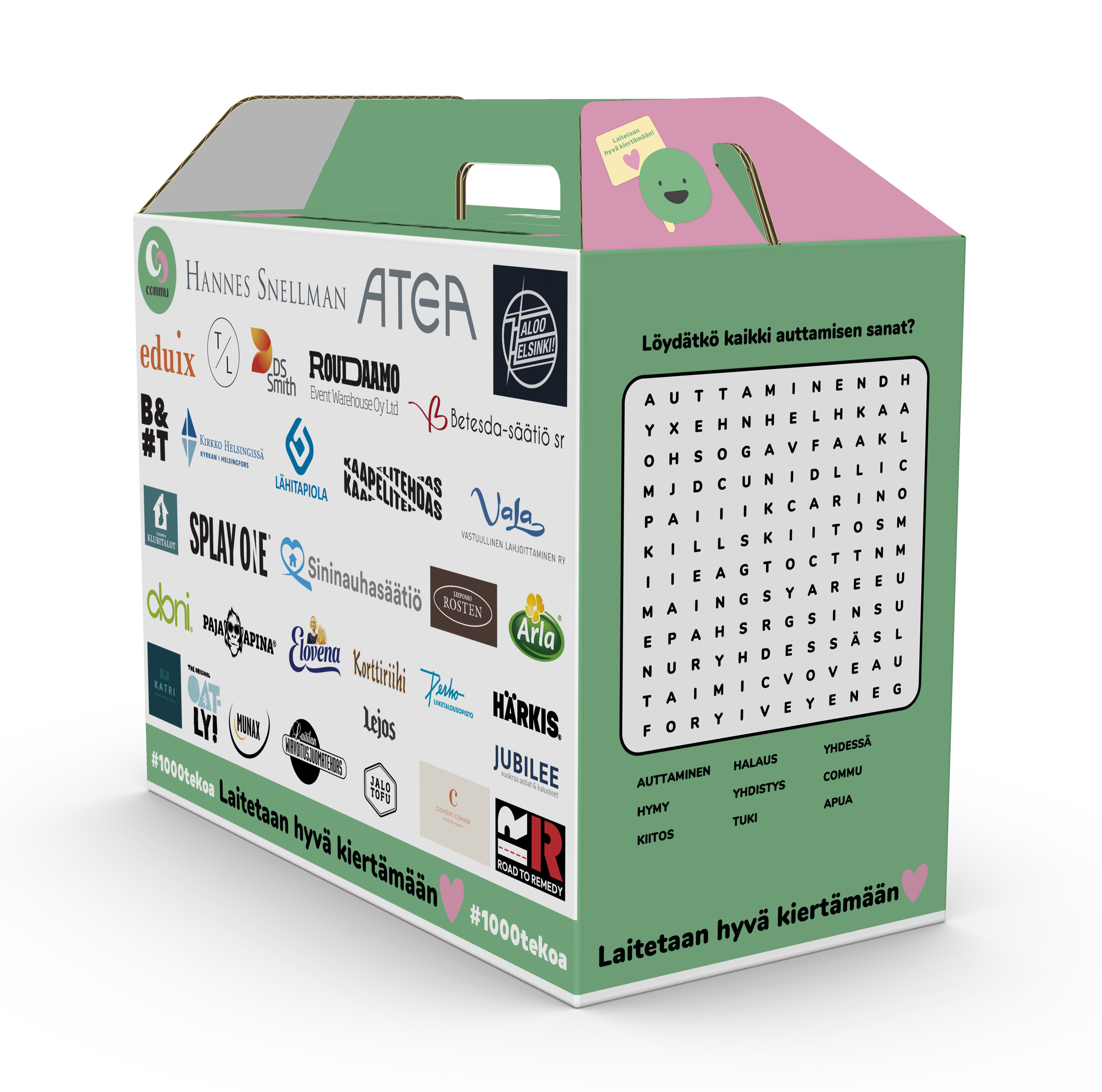 Tapahtumassa tuotteiden keräilyyn ja niiden koteihin kuljettamista varten käytettävät aaltopahvipakkaukset on suunniteltu DS Smithin suomalaisten suunnittelijoiden toimesta Commun toiveiden mukaisesti, ja ne on valmistettu DS Smithin ammattilaisten tekeminä Suomessa Tampereen ja Nummelan tehtailla. Jokaisessa pakkauksessa on mietitty sen jatkokäyttö: se on kaunis, kannustaa hyvän kiertoon laittoon ja soveltuu monenlaisien kodintavaroiden säilytykseen. Pakkauksen kyljessä on hauska tehtävä, jossa yhdeksän tärkeää auttamisen sanaa on piilotettu sanasokkeloon. Kun pakkauksesta joskus haluaa luopua, sen voi kierrättää kartonkikeräykseen, eikä jätettä synny lainkaan. Ajatuksena pakkauksen suunnittelussa on ollut sen tuottama ilo tuotteiden kuljettamisen lisäksi.