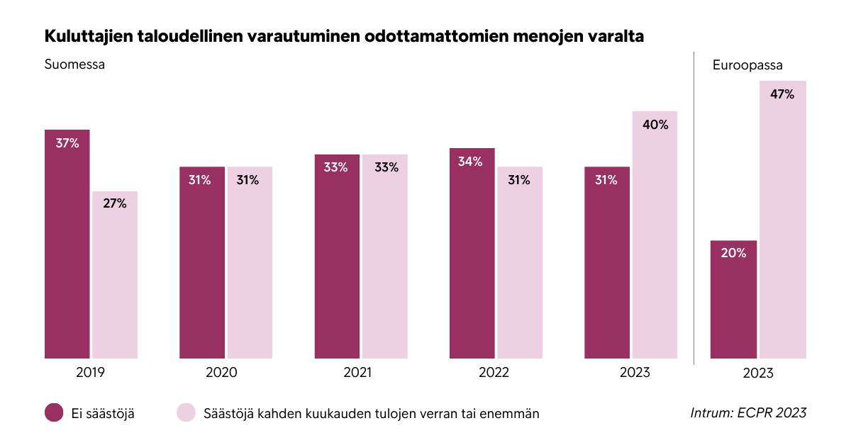 Monet kuluttajista ovat haavoittuvaisia, koska heillä ei ole minkäänlaista säästöpuskuria odottamattomien kulujen varalta. Huolestuttavaa on, että peräti 31 prosentilla kuluttajista ei ole lainkaan säästöjä hätätilanteiden varalle, mikä on huomattavasti useammalla kuin Euroopassa keskimäärin (20 prosenttia). Keskimäärin 16 prosentilla suomalaisista on vähemmän kuin yhden kuukauden tulojen verran säästössä, eurooppalaisten keskuudessa vastaava luku on 17 prosenttia.
