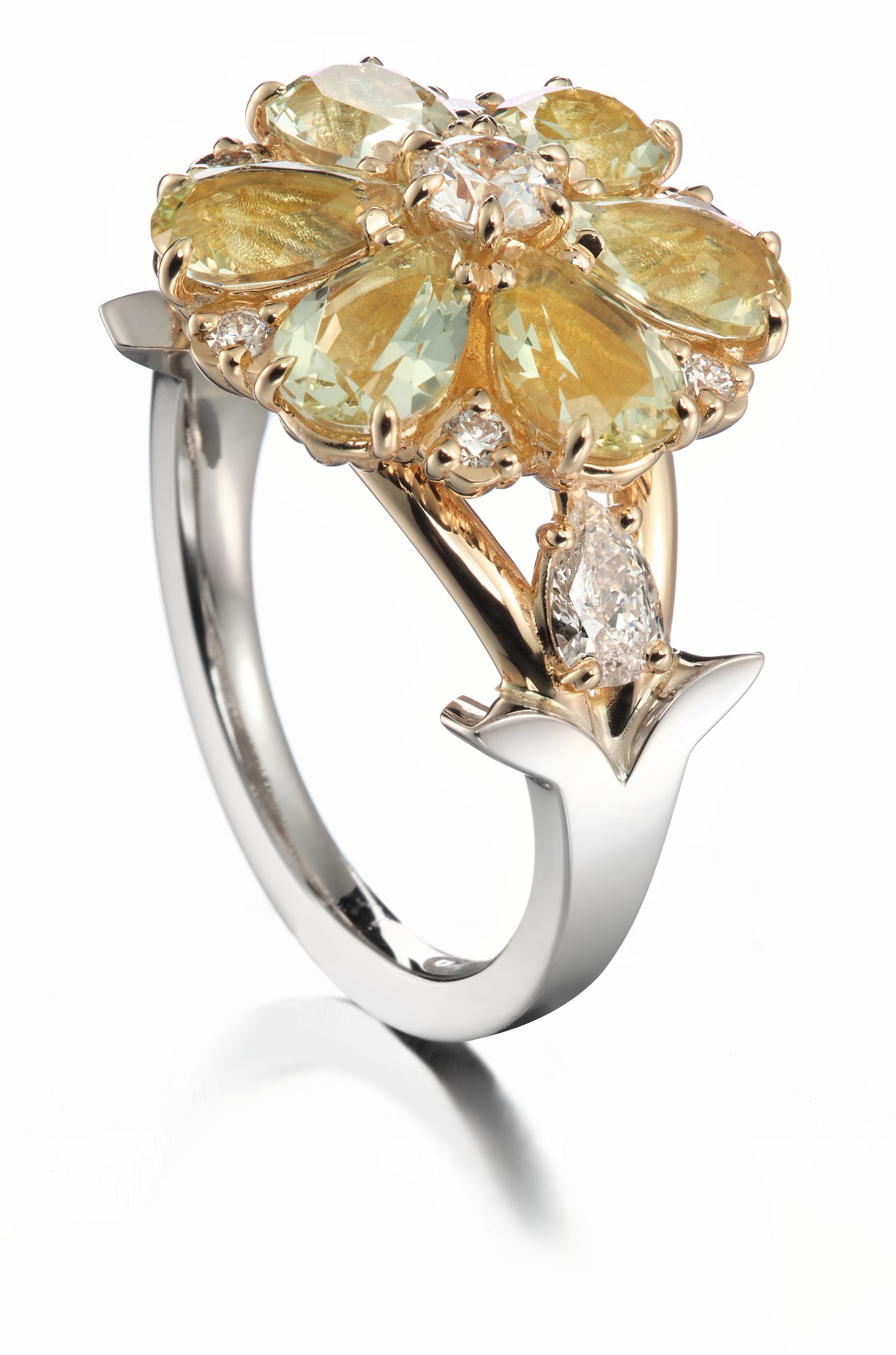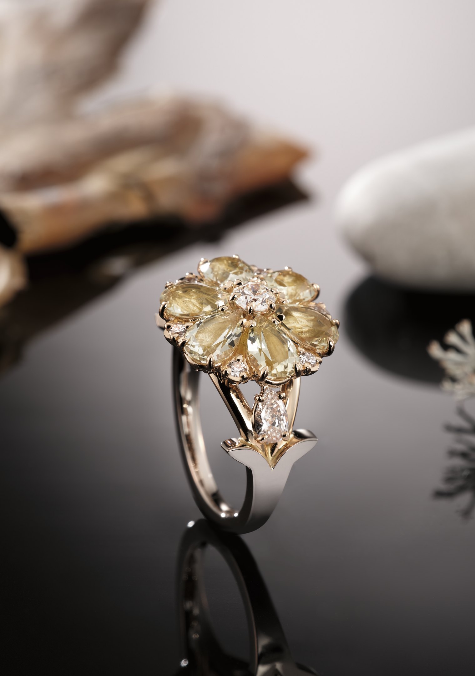 Juuret – tosin hieman toisenlaiset – näkyvät myös sormuksen muodossa ja materiaaleissa. Juuret – Roots -sormuksessa on käytetty yhteensä 3,06 karaattia heliodoreja, 18 karaatin valkokultaa ja keltakultaa yhdistettynä sekä 0,74 karaatin timantteja. Ukrainaa symboloiva kukan muoto tuli mukaan sitä kautta, että kaulakorussa käytetty pääkivi oli peräisin Ukrainasta ja hiottu valmiiksi 22.2.2022.
