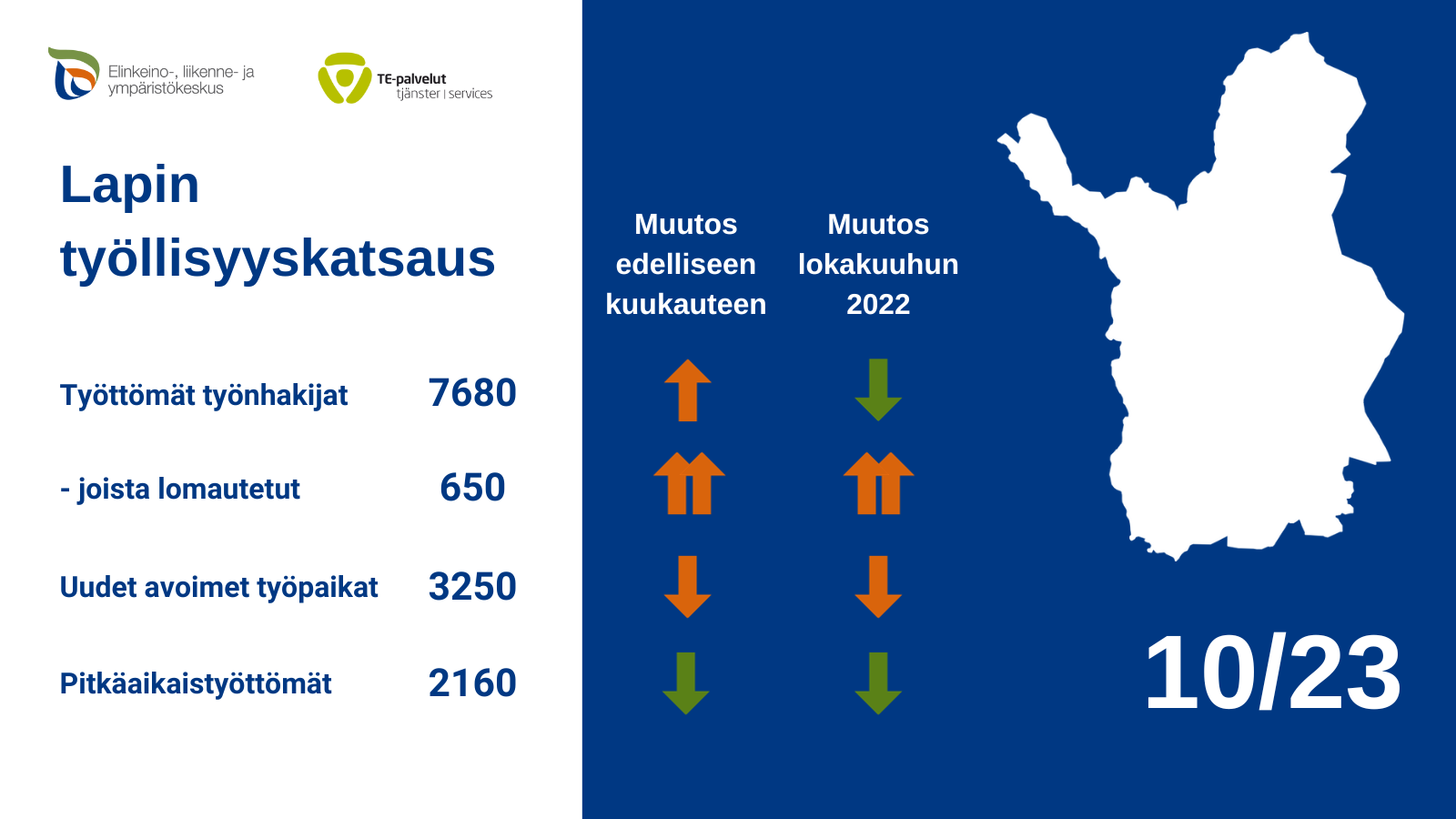 Lapissa oli lokakuun lopussa 7 680 työtöntä työnhakijaa, joista lomautettuja 650. Työttömiä oli 290 enemmän kuin syyskuussa, mutta 235 vähemmän kuin viime vuoden lokakuussa. Lomautukset ovat lisääntyneet kolmanneksella. Lokakuun työttömien määrä on ollut Lapissa viimeksi alempi vuonna 1989.