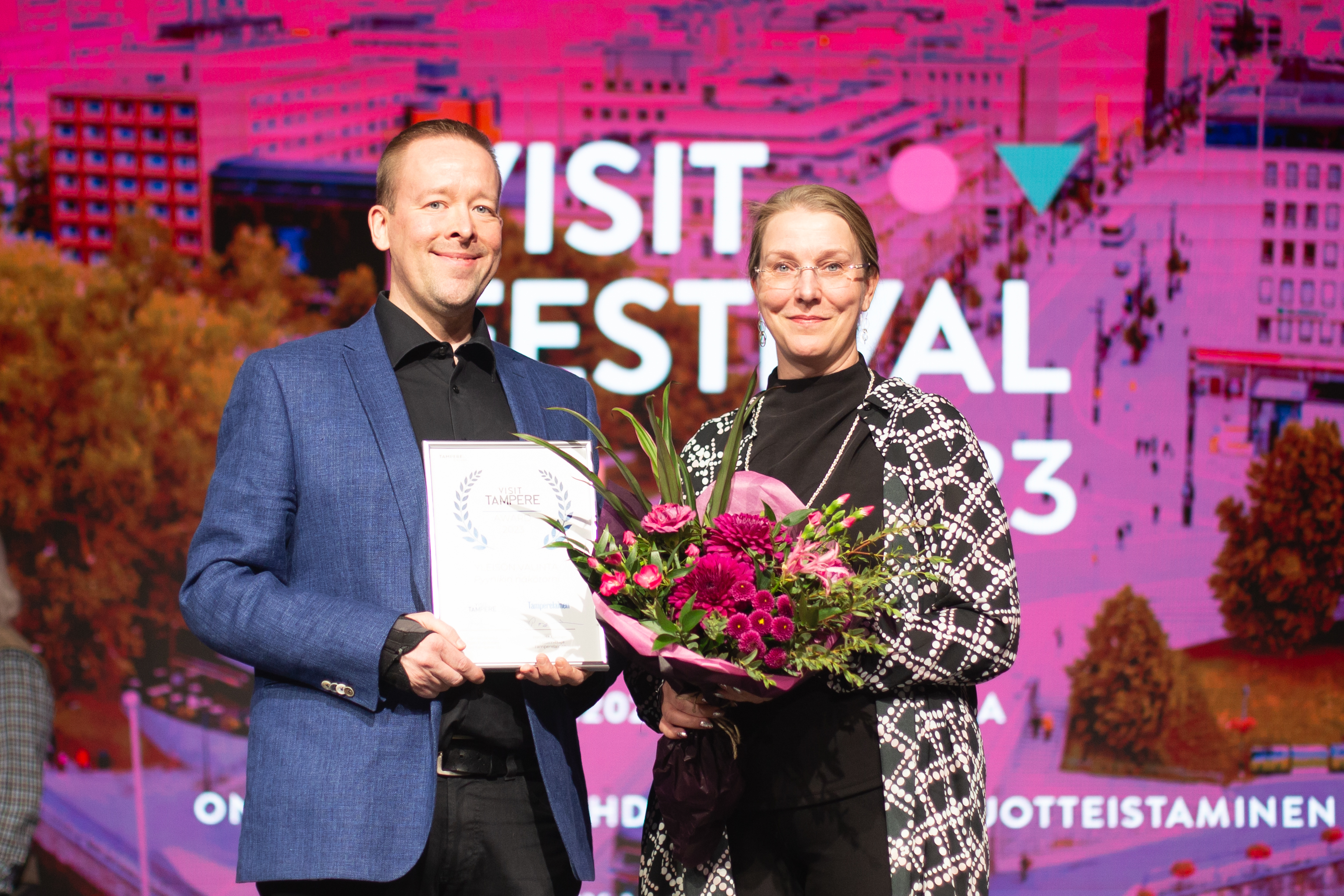 Jaro Suoste Pyynikin Munkkikahvilasta ja Virpi Ekholm Tampereen kaupungilta vastaanottivat Visi Tampere Award, yleisön valinta -palkinnon, joka toteutettiin Tamperelaisen ja Visit Tampereen yhteisellä yleisöäänestyksellä. Kuva: Laura Vanzo, Visit Tampere