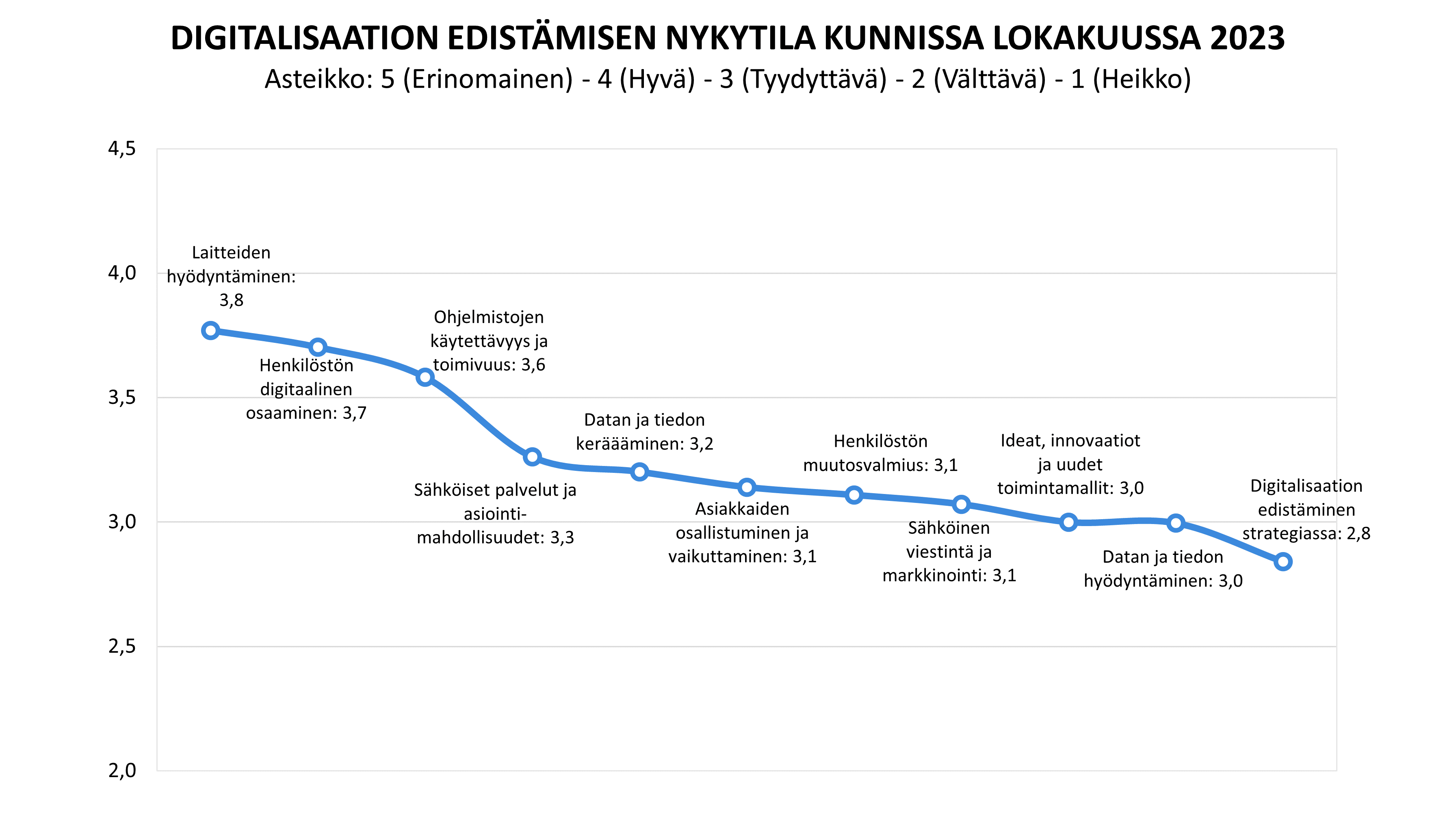 Eniten kehittämistarpeita kohdistuu digitalisaation edistämiseen kuntastrategiassa, datan ja tiedon hyödyntämiseen toiminnassa ja johtamisessa sekä ideoihin, innovaatioihin ja uusiin toimintamalleihin liittyviin kokeiluihin.
