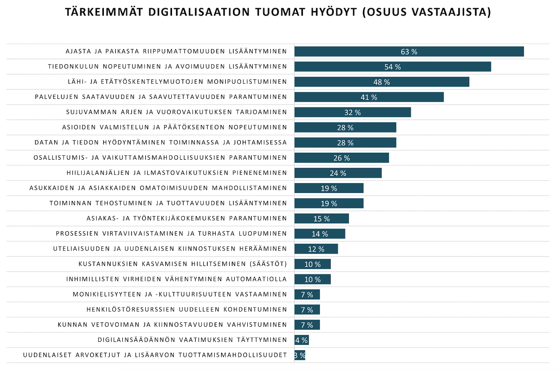 Digitalisaatiokyselyssä kuntien henkilöstö valitsi viisi mielestään tärkeintä digitalisaation tuomaa hyötyä.Tärkeimmiksi digitalisaation tuomiksi hyödyiksi henkilöstö nosti ajasta ja paikasta riippumattomuuden lisääntymisen sekä tiedonkulun nopeutumisen ja avoimuuden lisääntymisen. Myös lähi- ja etätyöskentelymuodot ovat monipuolistuneet ja palvelujen saatavuus ja saavutettavuus on parantunut.