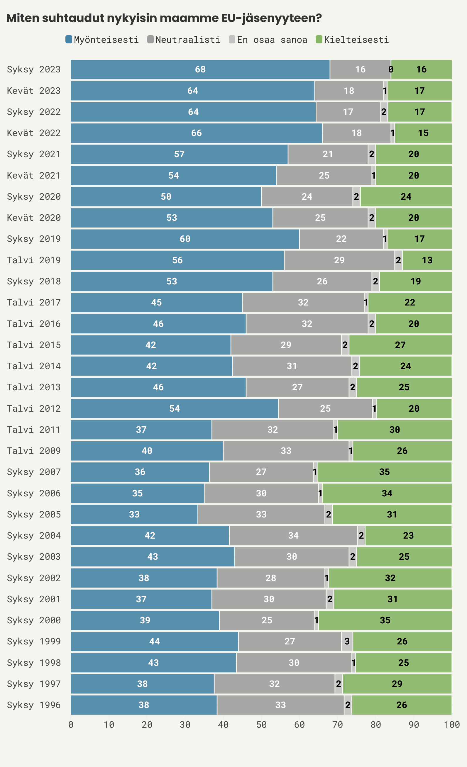 Yli kaksi kolmasosaa (68 %) suomalaisista suhtautuu Suomen EU-jäsenyyteen myönteisesti. Kielteisen kannan ottaa 16 prosenttia, ja yhtä moni suhtautuu unioniin neutraalisti. EU-myönteisyys on kasvanut syksyn 2020 edellisistä pohjalukemista 18 prosenttiyksikköä. Kolme vuotta sitten suomalaisten epäilevämpiä EU-asenteita selitti muun muassa keskustelu elpymispaketista, mutta tämän jälkeen havaitun kannatuksen kohentumisen selittää kansainvälisen politiikan tilanteen kiristyminen ja Venäjän hyökkäys Ukrainaan.