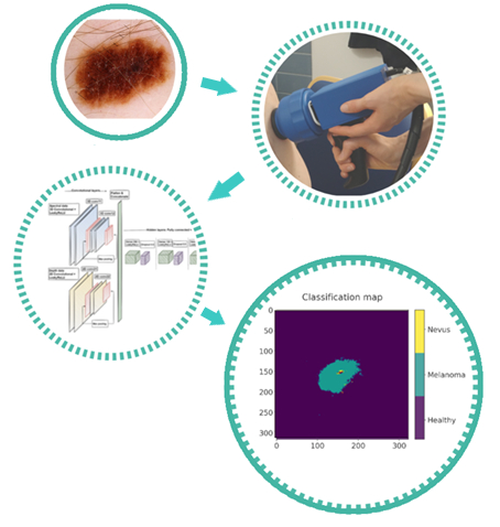 Kaavakuva hyperspektrikameratutkimuksesta. Tutkimuksessa ihomuutoksesta otettiin hyperspektrikuva, ja neuroverkkoanalyysi tarjosi kuvan perusteella muutoksen todennäköisimmän diagnoosin sekä piirsi muutoksesta karttamaisen kuvan.