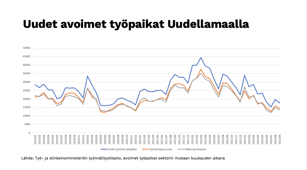Työvoiman kysyntä on laskenut vuoden 2022 kysyntäpiikin jälkeen. Syyskuussa 2023 Uudellamaalla ilmoitettiin työ- ja elinkeinoministeriön työnvälitystilaston mukaan noin 17 600 uutta työpaikkaa. Työvoiman kysyntä on lähes puolittunut (-47 %) viime vuoden syyskuuhun verrattuna. Koko Suomessa pudotus uusien avoimien työpaikkojen määrässä oli maltillisempaa (-36 %).