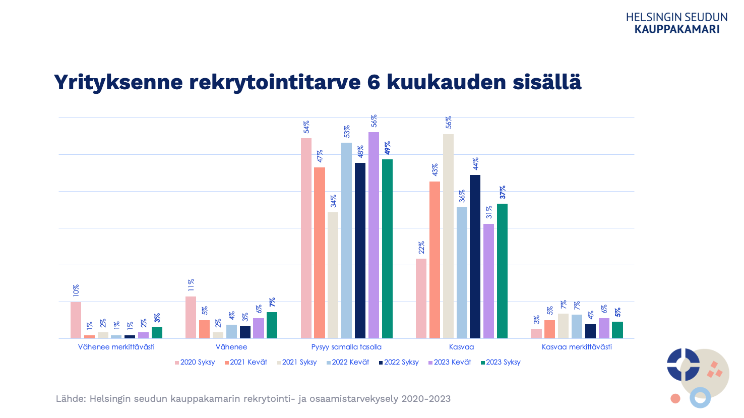 Helsingin seudun kauppakamarin jäsenyrityksilleen syyskuussa tekemässä kyselyssä vain kymmenen prosenttia vastaajista raportoi, että yrityksen rekrytointitarve vähenee seuraavan puolen vuoden aikana. Vastaajista 49 prosentin rekrytointitarpeet pysyvät samalla tasolla ja loput kertoivat rekrytointitarpeiden kasvavan tai kasvavan merkittävästi seuraavan kuuden kuukauden aikana.