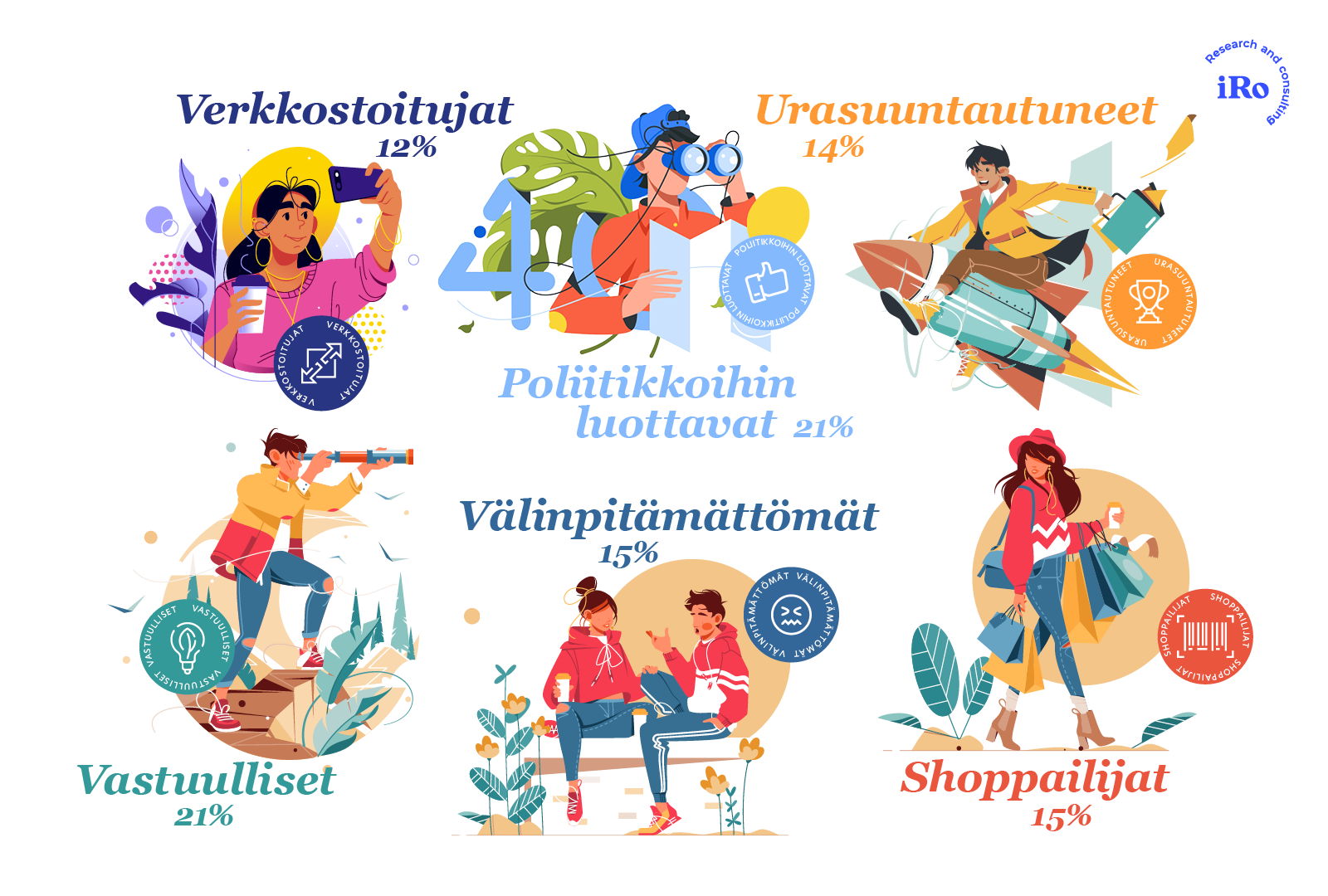 Haastatteluiden perusteella tutkimusyhtiö Iro Research tunnisti Z-sukupolvesta yhteensä kuusi eri segmenttiä: Vastuulliset (21 %), Poliitikkoihin luottavat (21 %), Shoppailijat (15 %), Välinpitämättömät (15 %), Urasuuntautuneet (14 %) ja Verkkostoitujat (12 %). Iro Research käsitteli tutkimusdataa tilastollisin monimuuttujamenetelmin, ja tulosten analysoinnin lopuksi laati selkeät kuvaukset löydetyille segmenteille.