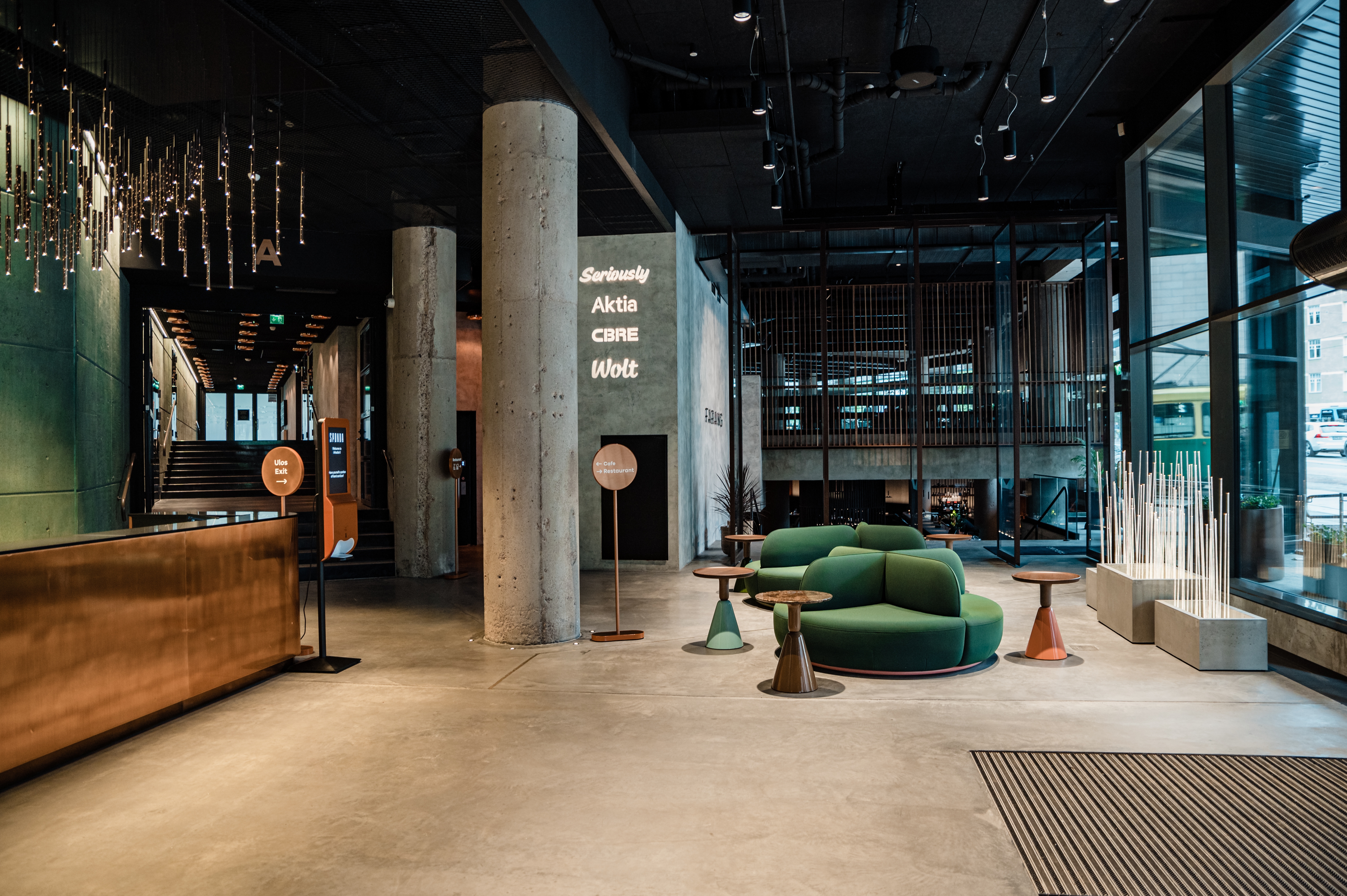 Arkadia 6, located on the edge of Narinkkatori, in the centre of Helsinki. The building includes a dedicated parking hall with charging points, comprehensive public transport connections, a restaurant, Farang, and is next to the Kamppi district’s services which surround the property., The reception area is often called the most spectacular office building lobby in Helsinki.