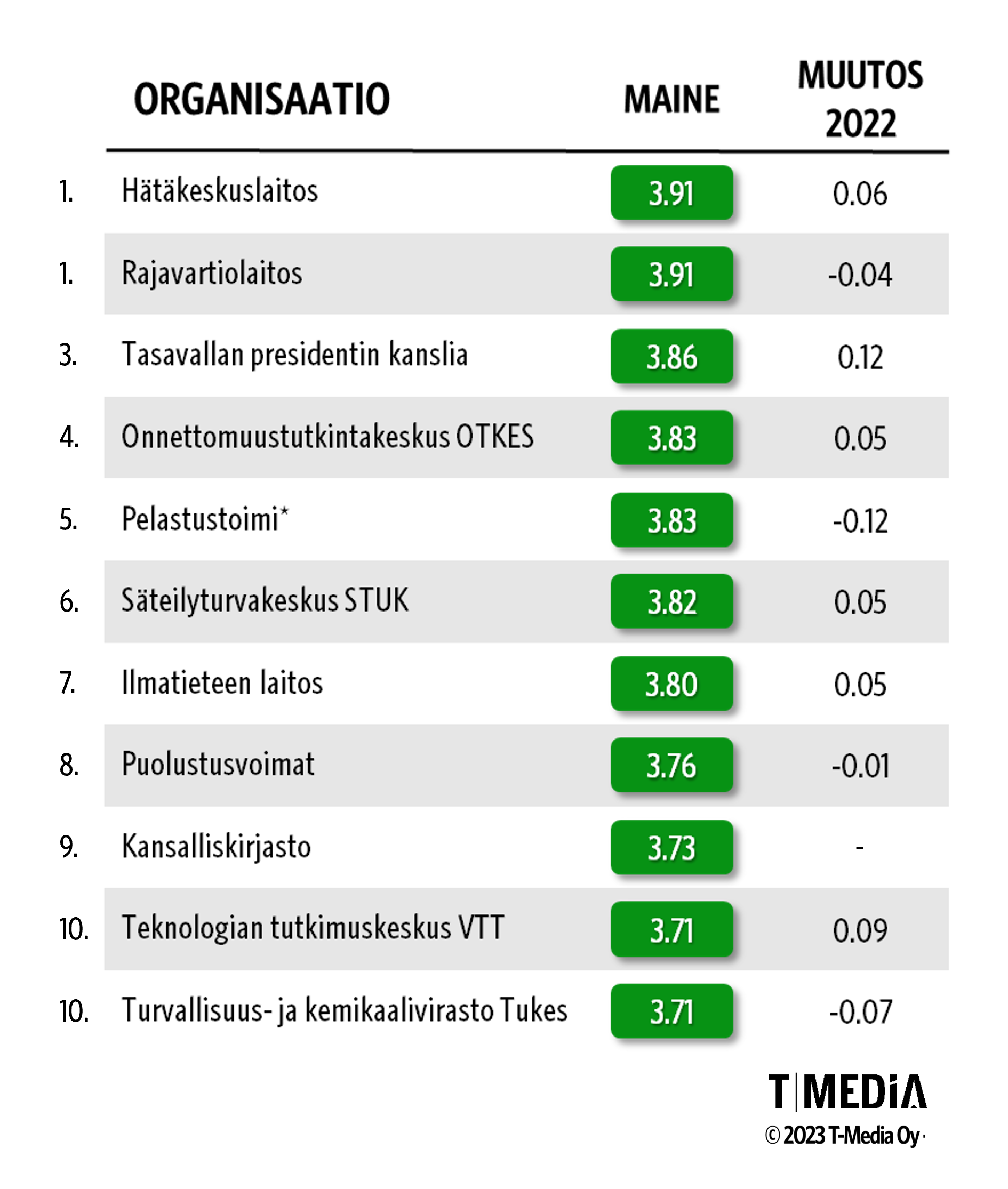 Hätäkeskuslaitos ja Rajavartiolaitos jakavat ykkössijan hyvämaineisimpina julkishallinnon organisaatioina T-Median toteuttamassa julkishallinnon Luottamus&Maine 2023 -tutkimuksessa. Kolmannella sijalla on tasavallan presidentin kanslia.