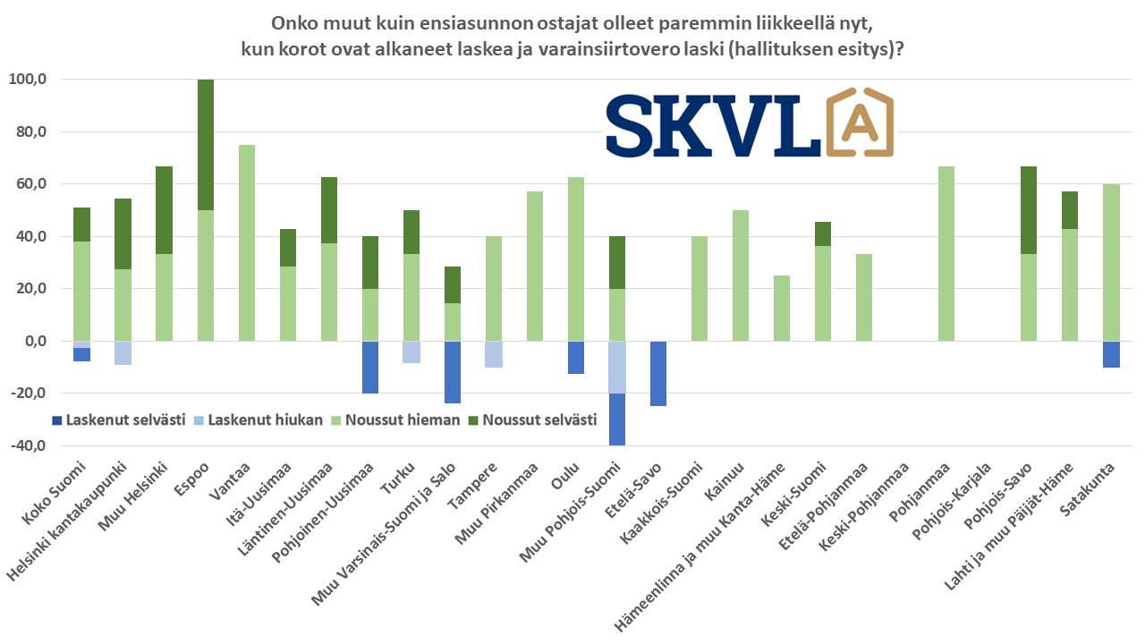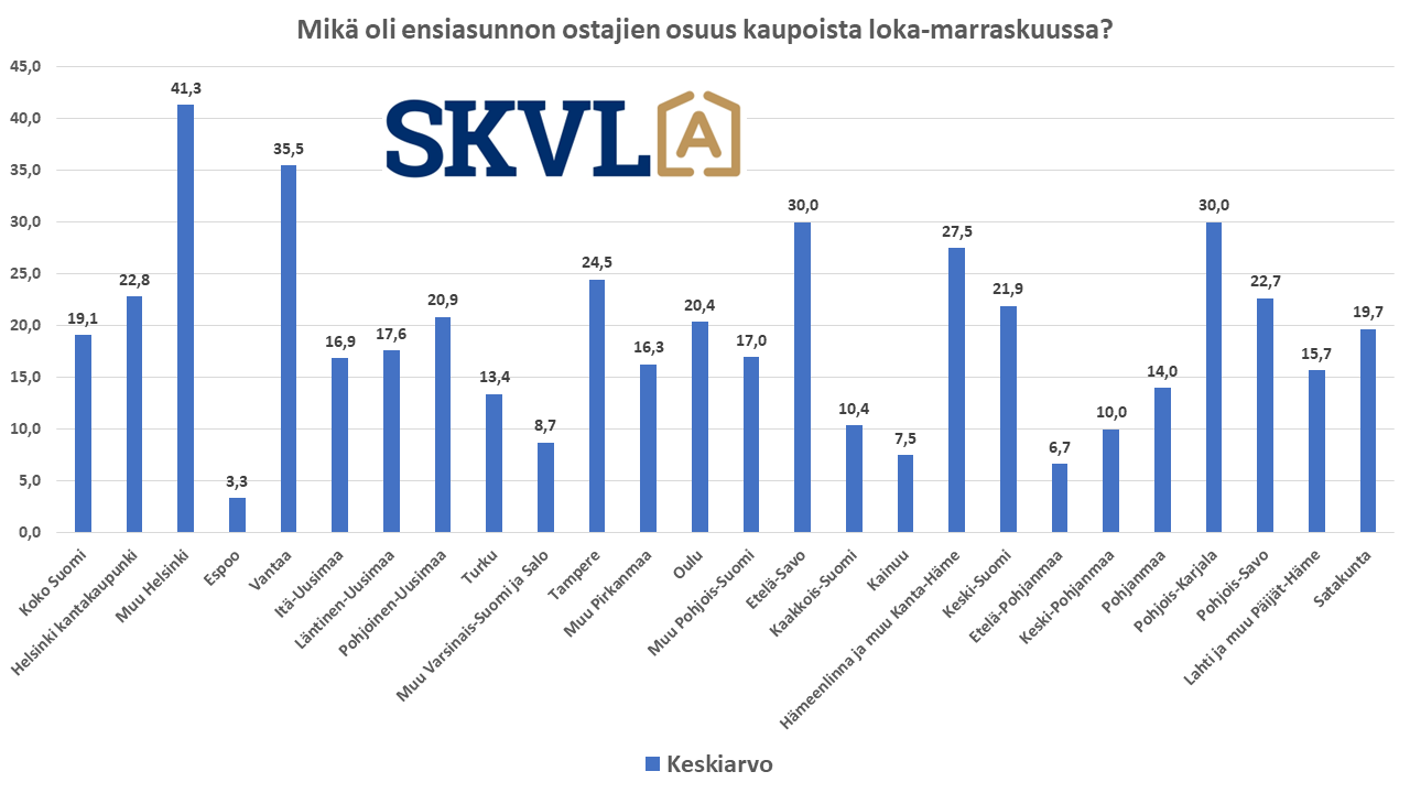 Alueesta riippuen ensiasunnon ostajien osuus kauppamääristä vaihtelee jonkin verran 5–30 % välillä. Erityisesti kasvukeskuksissa, joissa asuntojen hinnat ovat korkeammat, ovat ensiasunnon ostajat kiirehtineet hyödyntämään vapautusta varainsiirtoverosta ennen kuin hallituksen esityksen mukainen etuus poistunee vuodenvaihteessa. ”Olemme pahoillamme, että ensiasunnon ostajat joutuivat kilpajuoksuun veroedun päättymisen vuoksi. Monta kauppaa jää tekemättä pankkien ruuhkan vuoksi”, toteaa SKVL:n toimitusjohtaja Jussi Mannerberg. ”Tämä on ollut ehdottomasti toivottu piristysruiske markkinoille korkojen laskun lisäksi”, hän jatkaa.