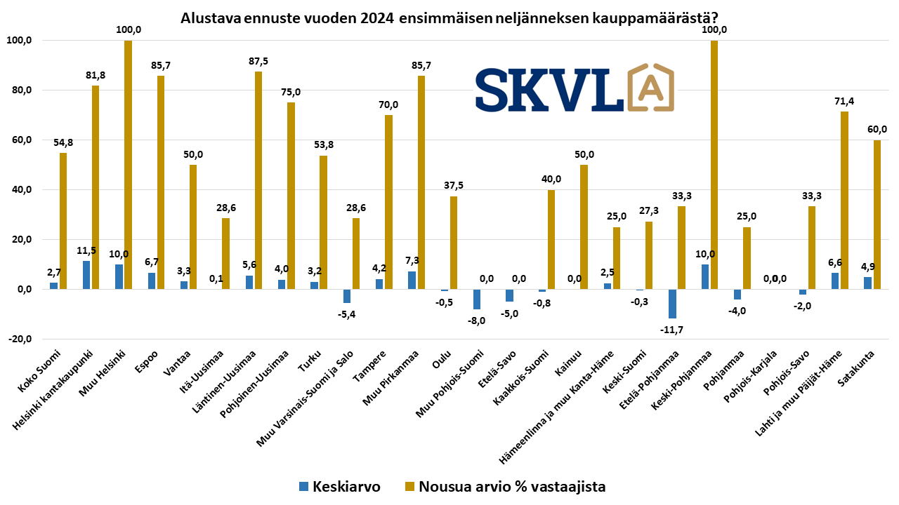 Suomen suurin ja vanhin asuntokaupan verkosto, edunvalvonta- ja palvelujärjestö Suomen Kiinteistönvälittäjät ry (SKVL) teki ylimääräisen markkinakyselyn joulukuun alussa. Loka-marraskuun vanhojen asuntojen kauppamäärät ovat selvästi nousseet nyt verrattuna edellisiin kuukausiin ja myös viime vuoden loka-marraskuun lukuja korkeammalle. Myös keskineliöhinnoissa on nyt nähty nousua verrattuna viime kuukausiin ja viime vuoden lopun hintoihin. Erityisesti Helsinki, Vantaa ja Espoo ovat olleet vahvassa, jopa noin 20 % nousussa osakekauppojen osalta. Myös omakotitalokauppa käy vuodenaikaan nähden hyvin. Muu Suomikaan ei ole enää laskenut vaan kauppamäärien nousua nähdään osakeasuntokaupoissa keskimäärin noin 10 % verrattuna edellisiin kuukausiin. Luvut ovat myös todennettu vastaaviksi KVKL:n hintaseurantapalvelussa.
