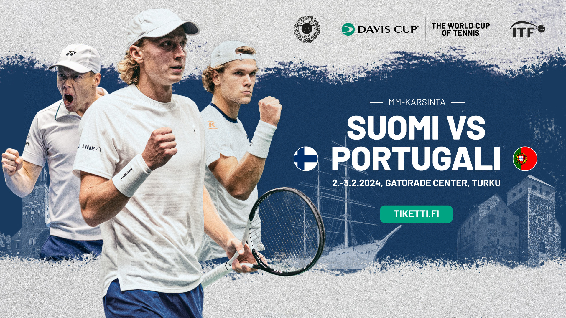 Tenniksen merkittävimmän maajoukkueturnauksen eli Davis Cupin karsintaottelu järjestetään Turussa Gatorade Centerissä 2.–3.2.2024. Ottelussa Suomen miesten maajoukkue Porsche Davis Cup Team Finland kohtaa Portugalin.