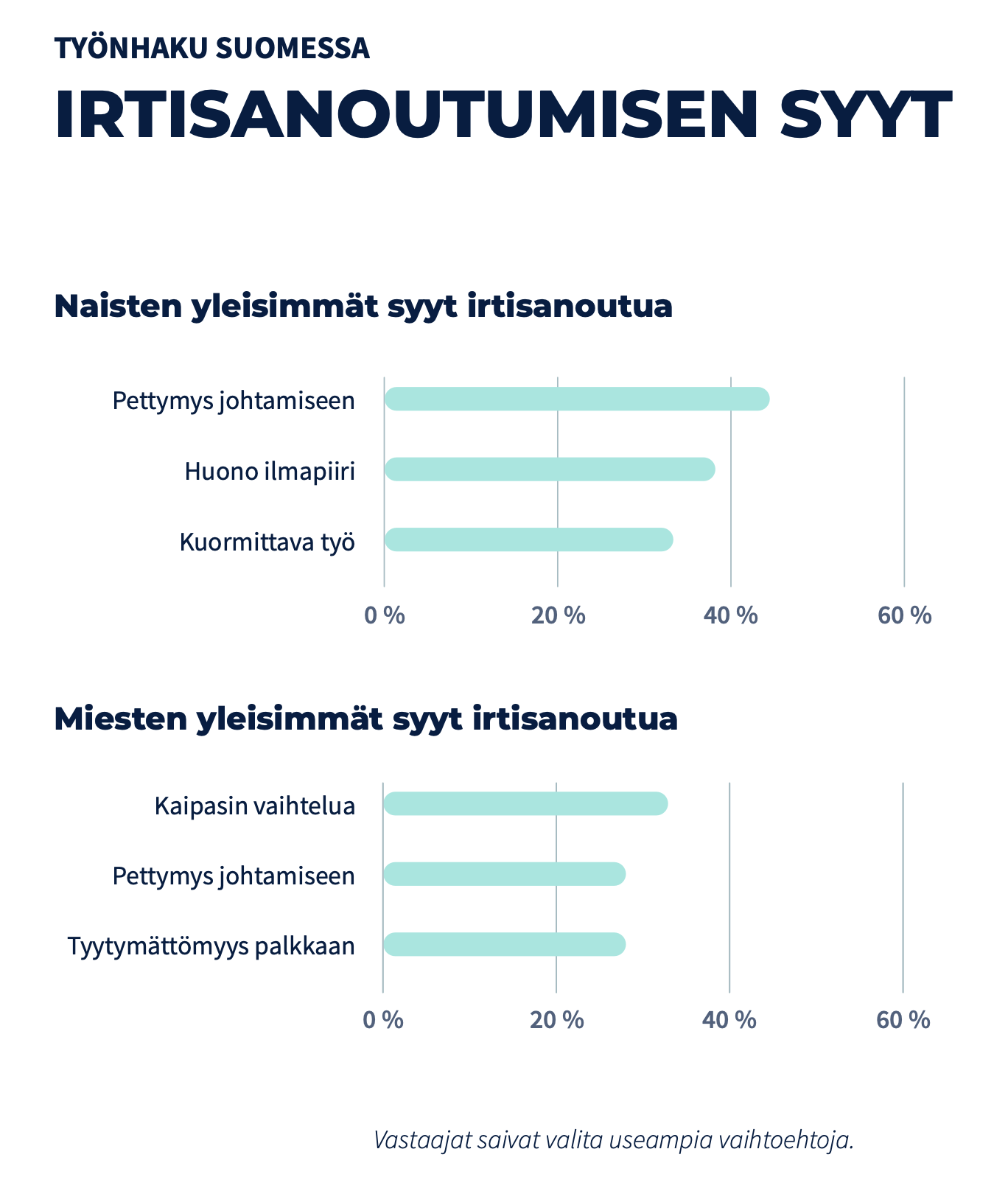 Pettymys johtamiseen on mukana sekä miesten että naisten yleisimmissä syissä, mutta muuten listat poikkeavat toisistaan.