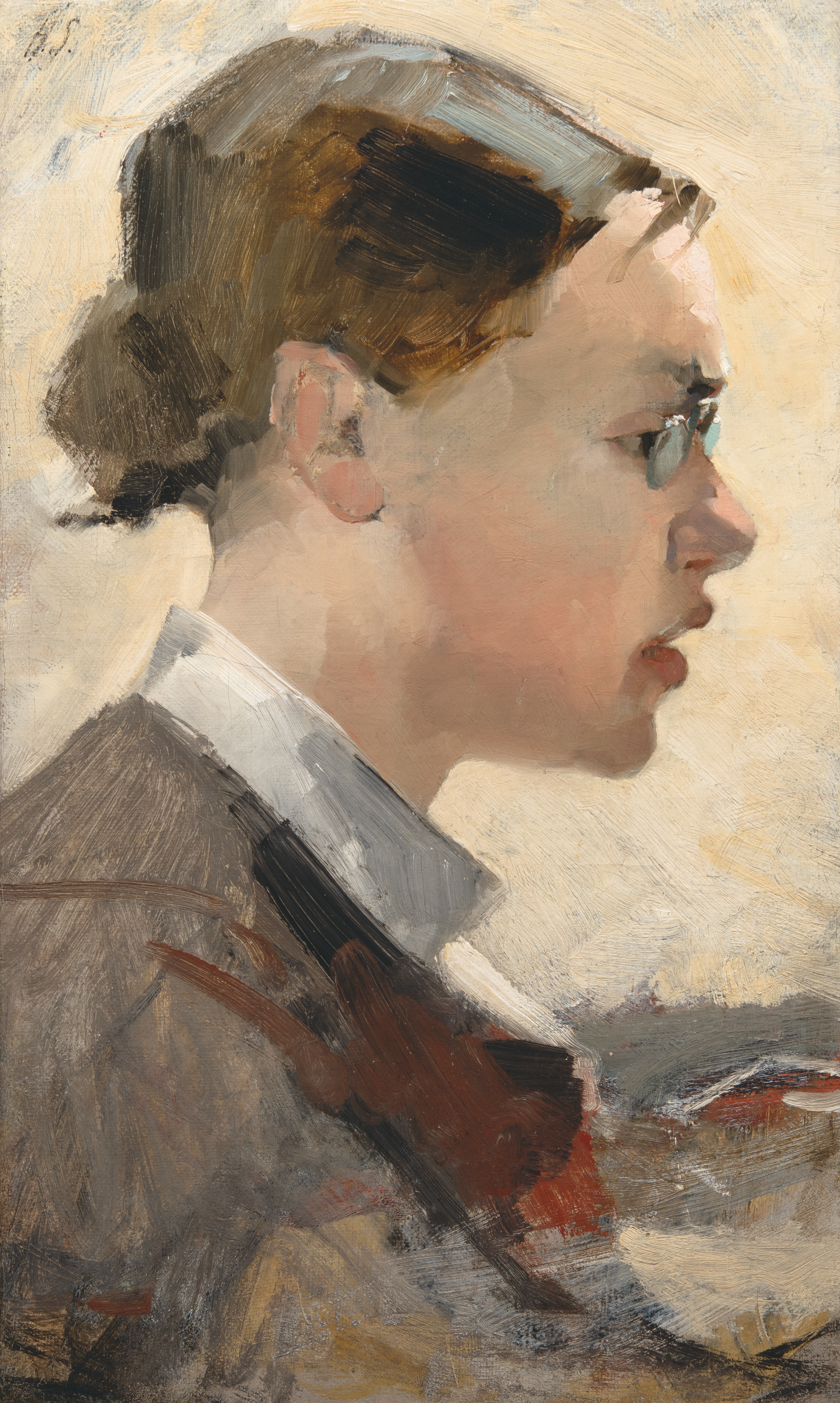 Helene Schjerfbeck: ”Helena Westermarck”, 1884, öljy kankaalle, 37,5 ✕ 22,5 cm. Teos oli esillä Gösta Serlachiuksen kokoelmaa esitelleessä näyttelyssä Ateneumissa vuonna 1919.