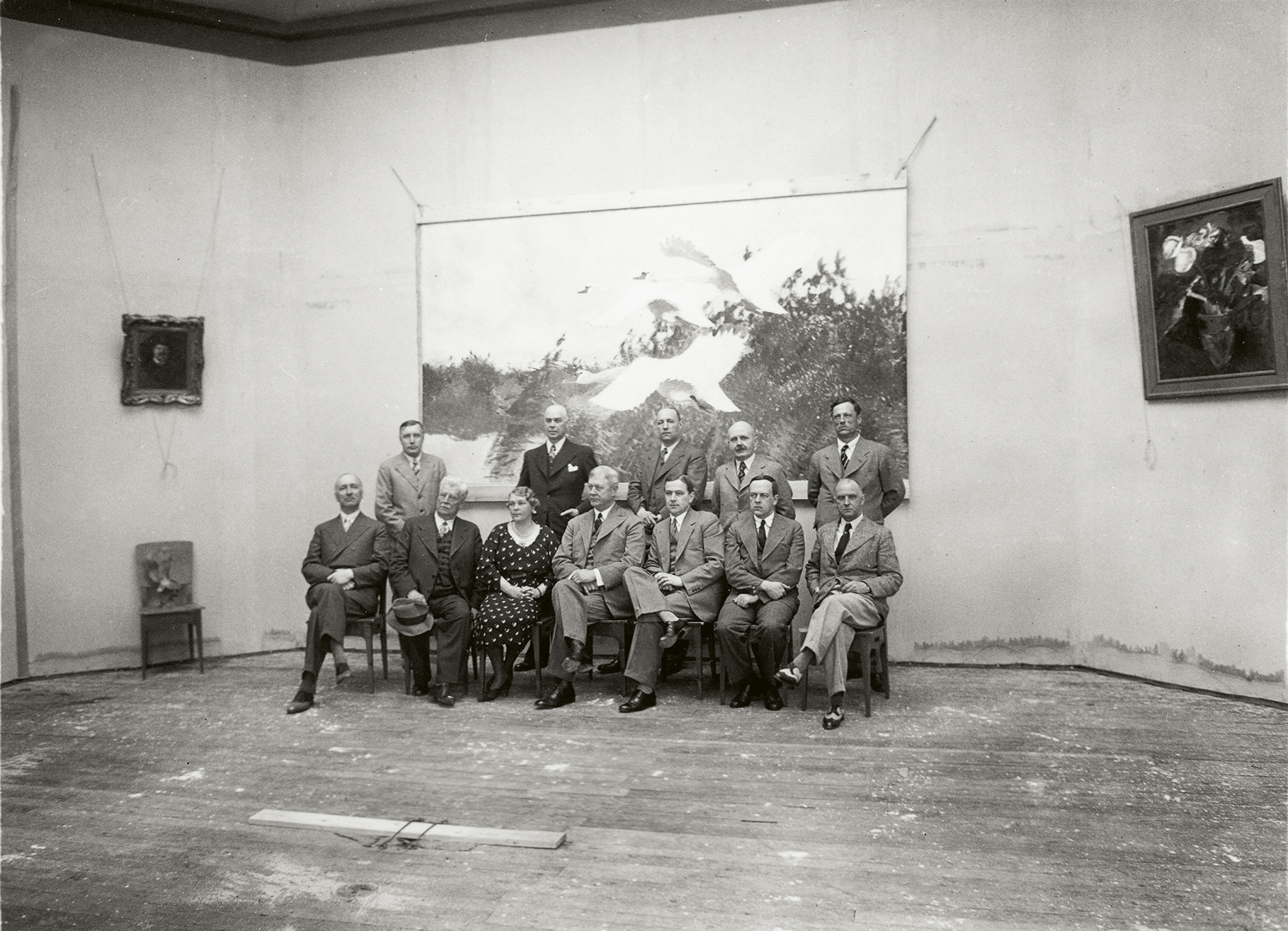 Säätiön isännistö tulevan museon valaistusolojen tutkimista varten rakennetussa koehallissa kesäkuussa 1937. Istumassa vasemmalta professori P. O. von Törne, kuvanveistäjä Emil Wik¬ström, vuorineuvoksetar Ruth Serlachius, vuorineuvos Gösta Serlachius, fil.tri Bertel Hintze, fil.tri Magnus Björken¬heim, taiteilija Marcus Collin. Seisomassa vasemmalta rakennusmestari Mäkelä, arkkitehti Jarl Eklund, taiteilija Lennart Segerstråle, tohtori Edvard Richter ja yli-insinööri Warner Silfversparre.