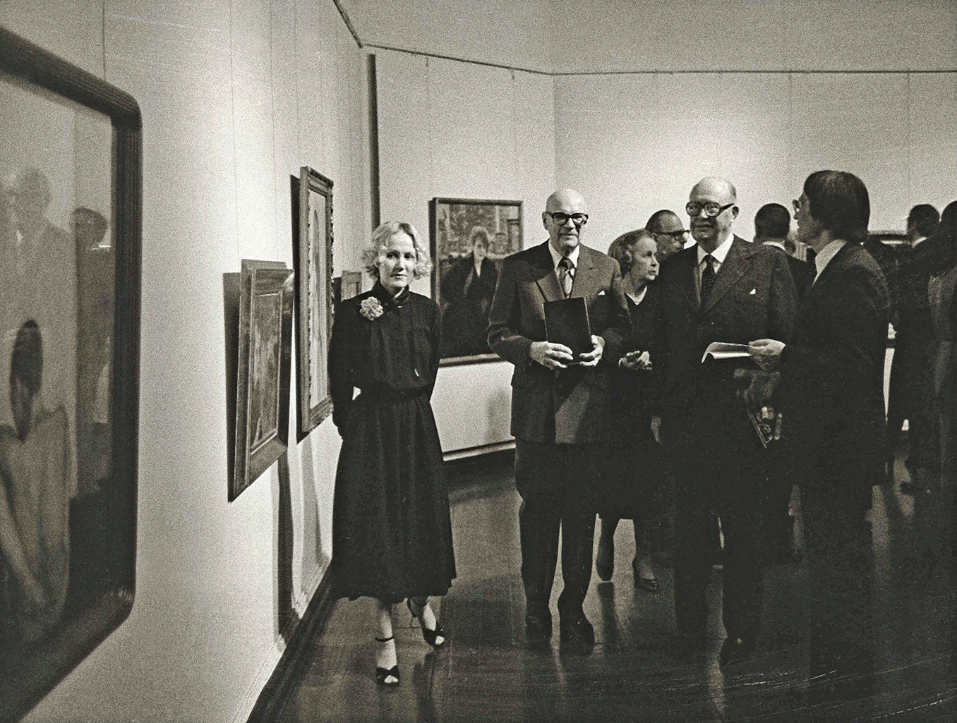 Intendentti Maritta Pitkänen esittelee ”Serlachiuksen kokoelmat” -näyttelyä tasavallan presidentti Urho Kekkoselle Ateneumissa vuonna 1980.