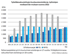 Ikäryhmittäin tarkasteltuna vakuutetut kuukausiansiot ovat korkeimmillaan 45–49-vuotiailla palkansaajilla. Heillä mediaaniansiot olivat yli 3 600 euroa kuukaudessa vuonna 2022.