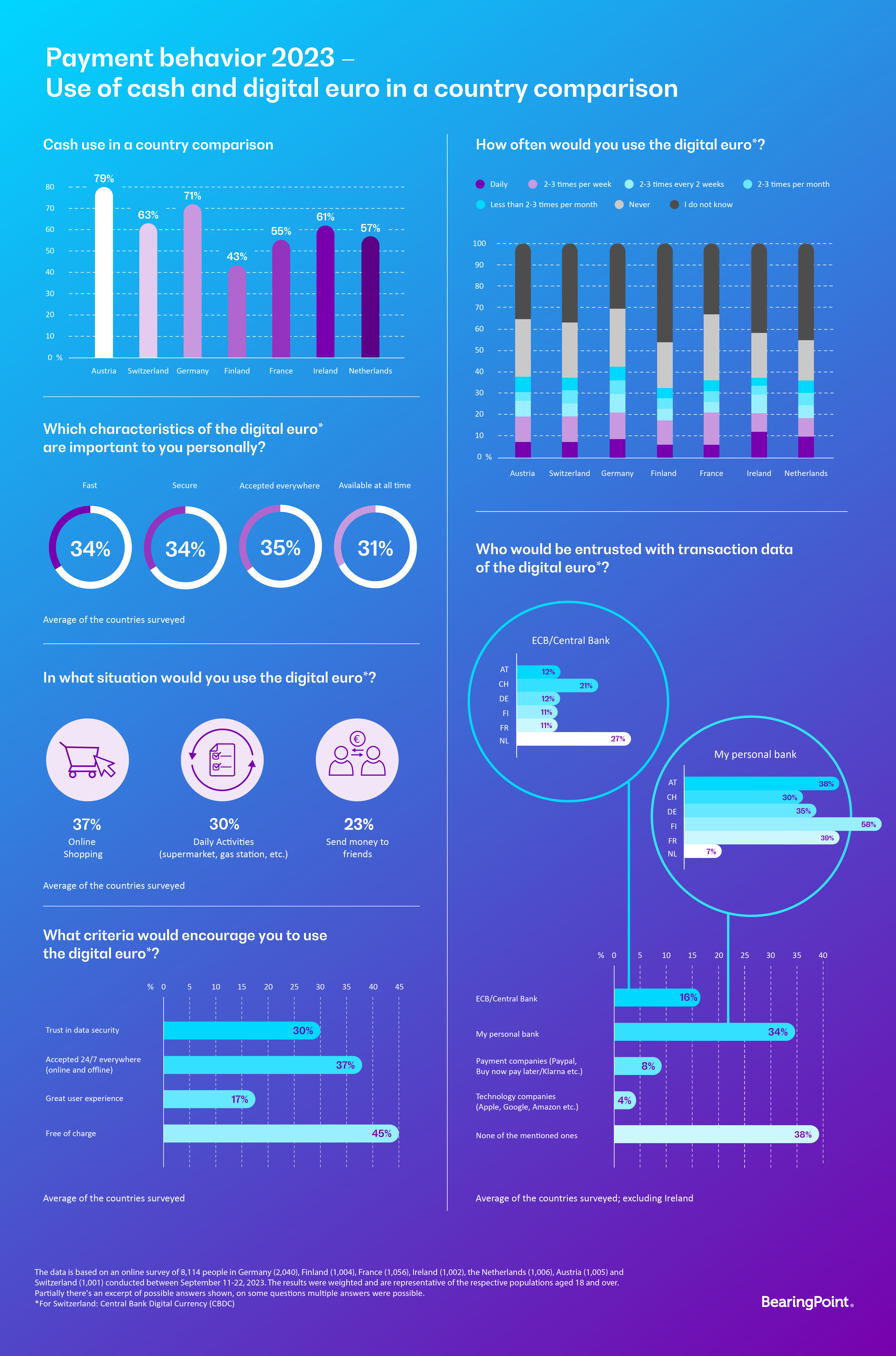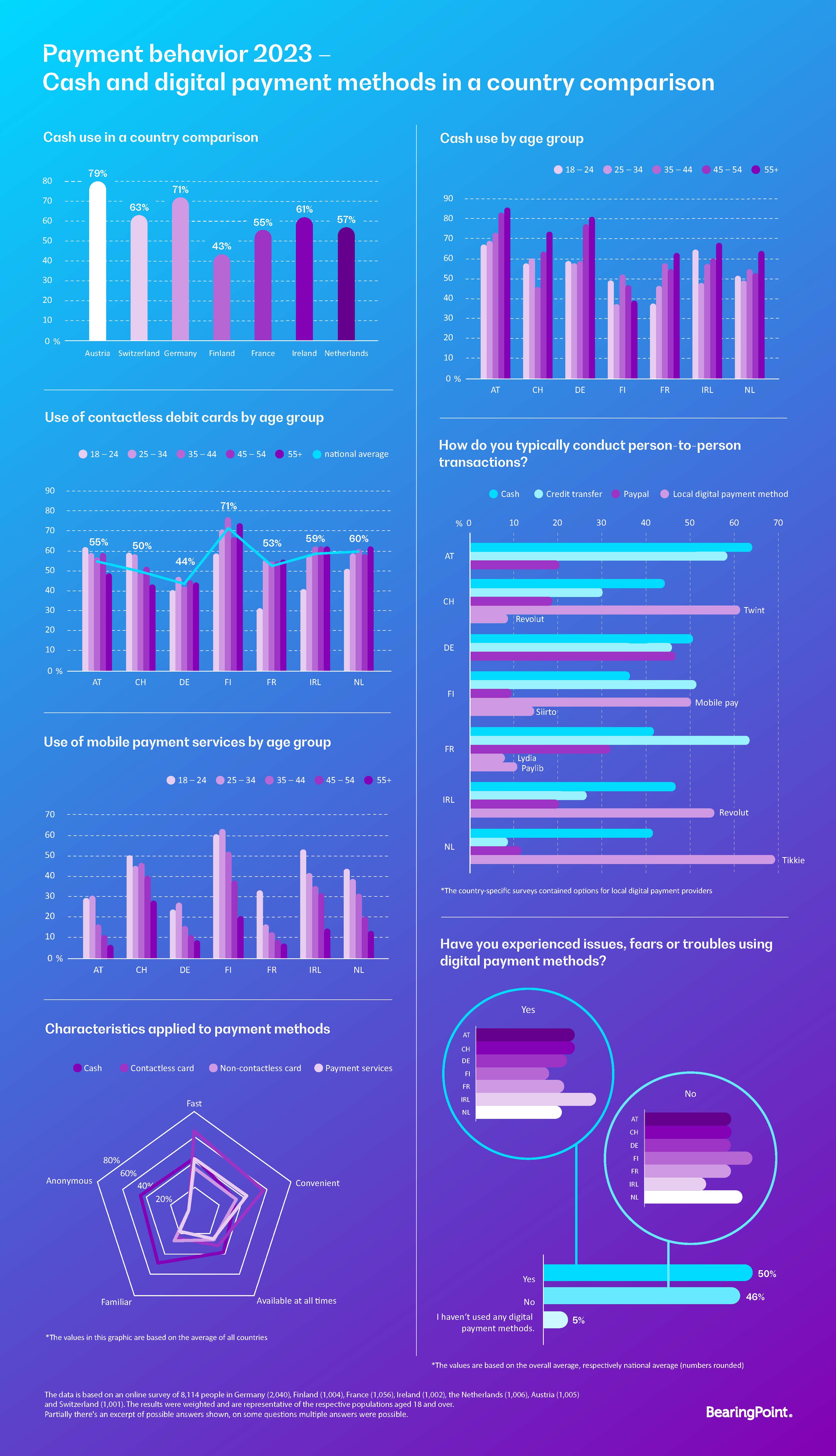 Tiedot perustuvat 8 114 henkilön verkkokyselyyn, joka toteutettiin Suomessa (1 004), Saksassa (2 040), Ranskassa (1 056), Irlannissa (1 002), Alankomaissa (1 006), Itävallassa (1 005) ja Sveitsissä (1 001) syyskuussa 2023. Tulokset ovat painotettuja, ja ne edustavat 18 vuotta täyttänyttä väestöä. Kyselyn suunnitteli BearingPoint, ja sen toteutti markkinatutkimuslaitos YouGov. Analyysin toteuttivat BearingPointin maksuliikenneasiantuntijat. BearingPoint on toteuttanut kyselyn Saksassa, Itävallassa ja Sveitsissä säännöllisesti vuodesta 2019 lähtien ja laajensi otantaa muihin Euroopan maihin ensimmäistä kertaa tänä vuonna.