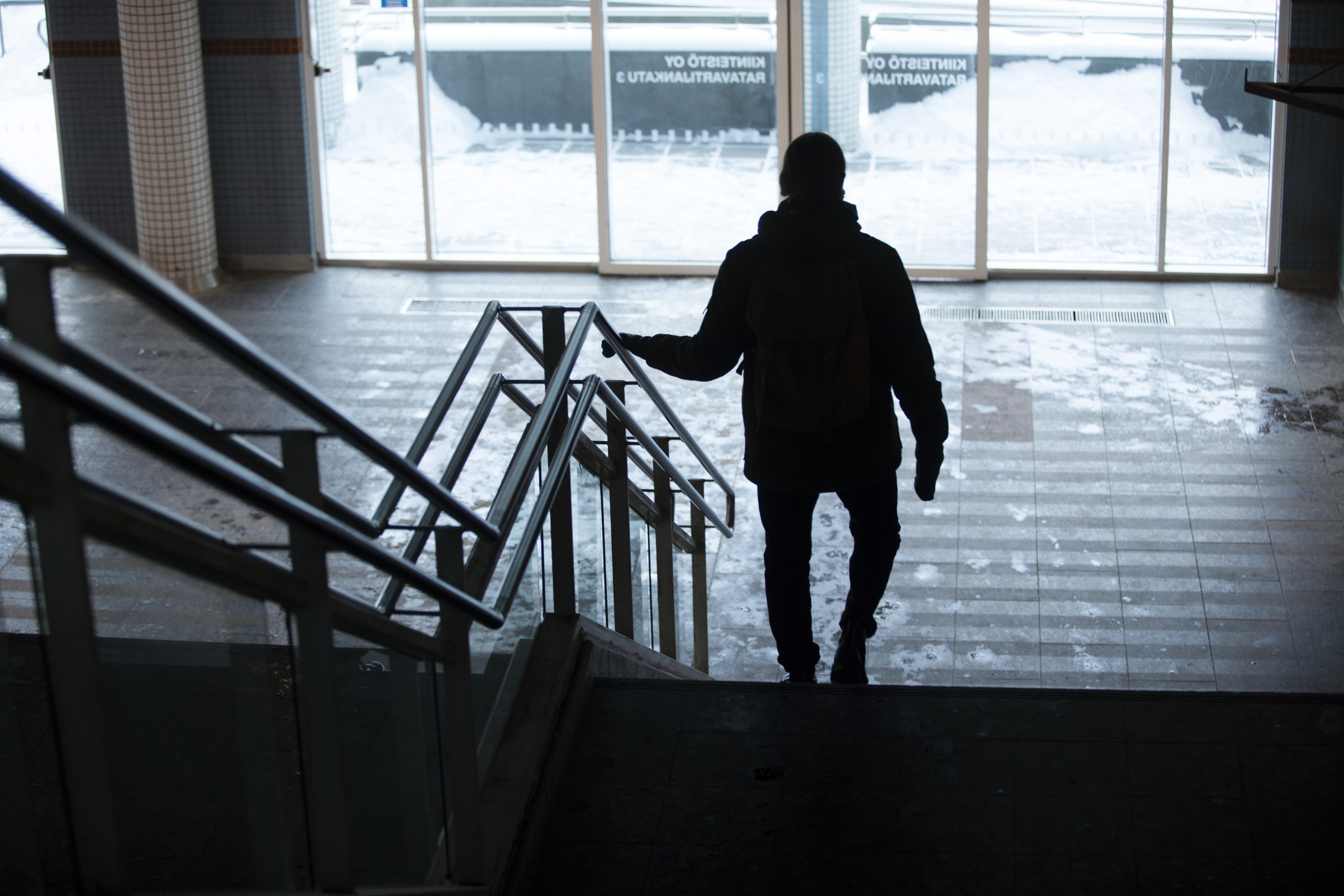 Henkilö kävelee portaita alas ja pitää kaiteesta kiinni. Tummasävyinen tunnelma.