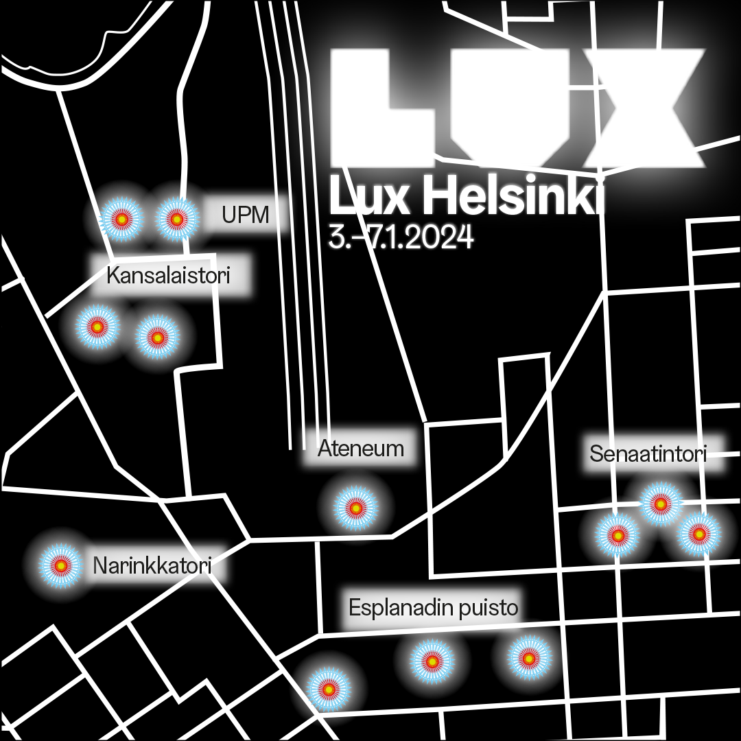 Suomen suurin valotaidetapahtuma Lux Helsinki käynnistyy tänään keskiviikkona 8. tammikuuta. Tapahtumaa vietetään sunnuntaihin 12. tammikuuta asti. Tähän tiedotteeseen on koottu tärkeimmät tiedot tapahtuma-ajan aikatauluista ja palveluista.