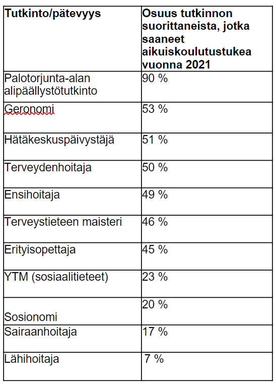 Lisäksi paloesimiestutkinnon suorittaneista 90 prosenttia, hätäkeskuspäivystäjän tutkinnon suorittaneista 51 prosenttia, terveydenhoitajan tutkinnon suorittaneista 50 prosenttia, ensihoitajan tutkinnon suorittaneista 49 prosenttia, sosionomin tutkinnon suorittaneista 20 prosenttia ja geronomin tutkinnon suorittaneista 53 prosenttia on käyttänyt aikuiskoulutustukea.
