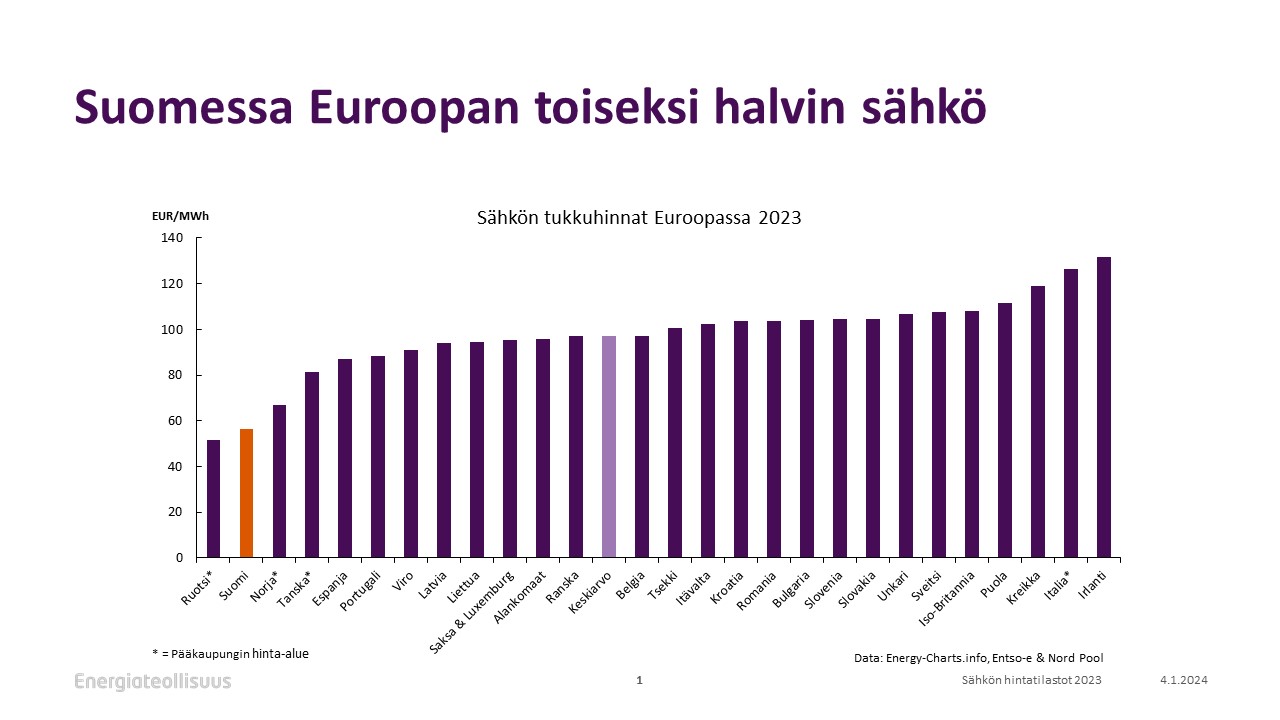 Viime vuoden aikana suomalainen sähkö oli toiseksi halvinta Euroopassa, ilmenee Energiateollisuuden julkistamista tilastoista. Sähkön hinta on noudattanut Tukholman alueen sähkön hintaa, joka oli vuoden 2023 osalta aavistuksen halvempi kuin Suomen hinta. Merkittävänä poikkeuksena Suomen ja Tukholman alueen yhtenäisiin hintoihin oli elokuu, jolloin kaksi ydinvoimalayksikköä oli pois tuotannosta, tuuli vähän, eikä sähkön ja lämmön yhteistuotantoa ollut lämpimän vuodenajan vuoksi tarjolla. Lisäksi siirtoyhteydet Ruotsiin toimivat vajaateholla. Ruotsissa sähkömarkkinat jakautuvat puutteellisten siirtoyhteyksien takia neljään hinta-alueeseen, joista halvin on pohjoisessa, kallein eteläisimmässä Ruotsissa.