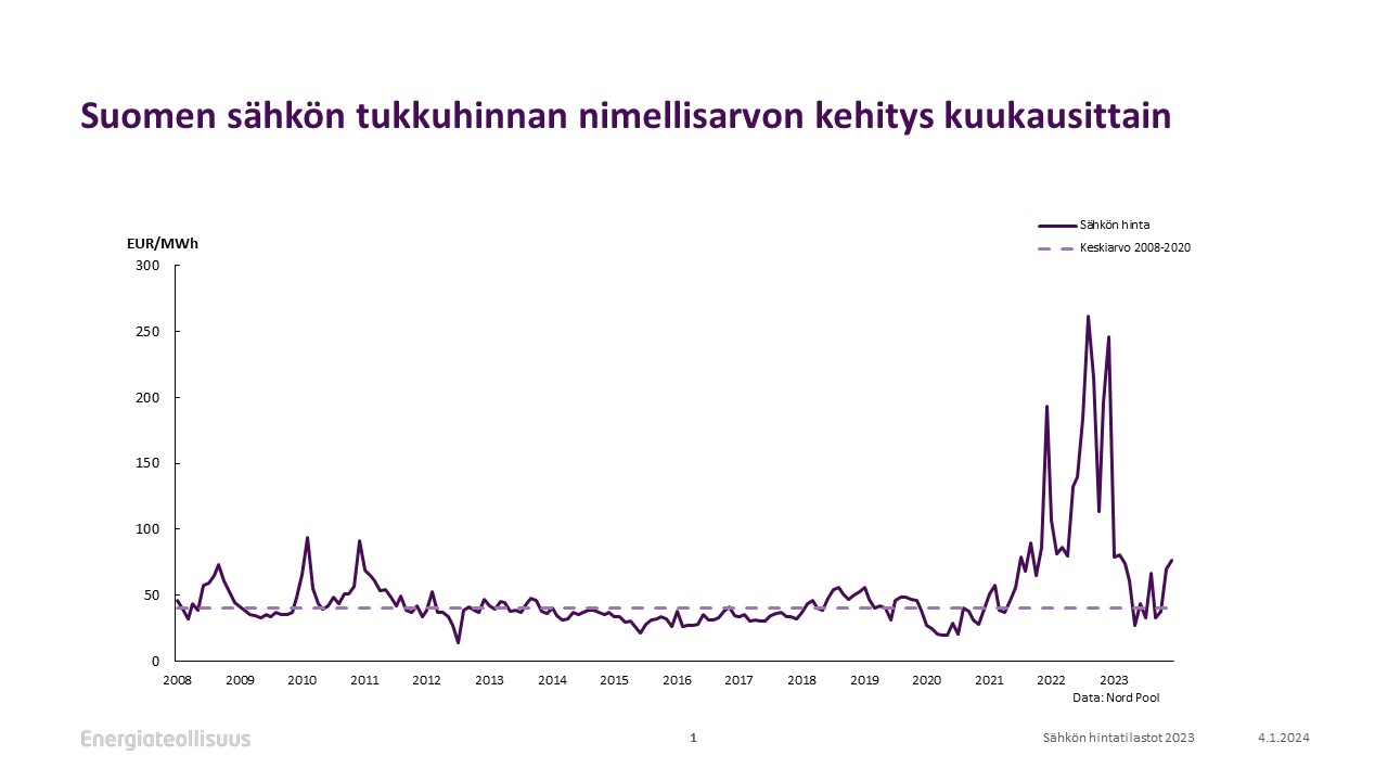 Sähkön keskihinta oli 56,5 €/MWh vuonna 2023. Kalleimmat kuukaudet olivat elokuu, marraskuu ja joulukuu, halvimmat vastaavasti toukokuu, syyskyy ja lokakuu. Tuulivoiman osuuden kasvu on lisännyt sähkön hintavaihteluita, jotka nousivat uudelle tasolle. Lisääntynyt tuulivoima ja Olkiluoto 3:n valmistuminen heikensivät sähkön hinnan kytköstä Keski-Eurooppaan.