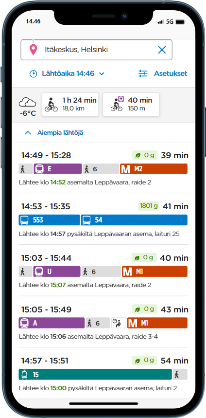 HSL:n reittioppaassa voi nyt vertailla reittiensä hiilidioksidipäästöjä. Päästöt näkyvät vihreällä reittiehdotusten yläpuolella. Päästötieto on määritelty jokaiselle linjalle erikseen, ja se perustuu liikennevälineen kalustotyyppiin ja sen tuottamiin päästöihin.