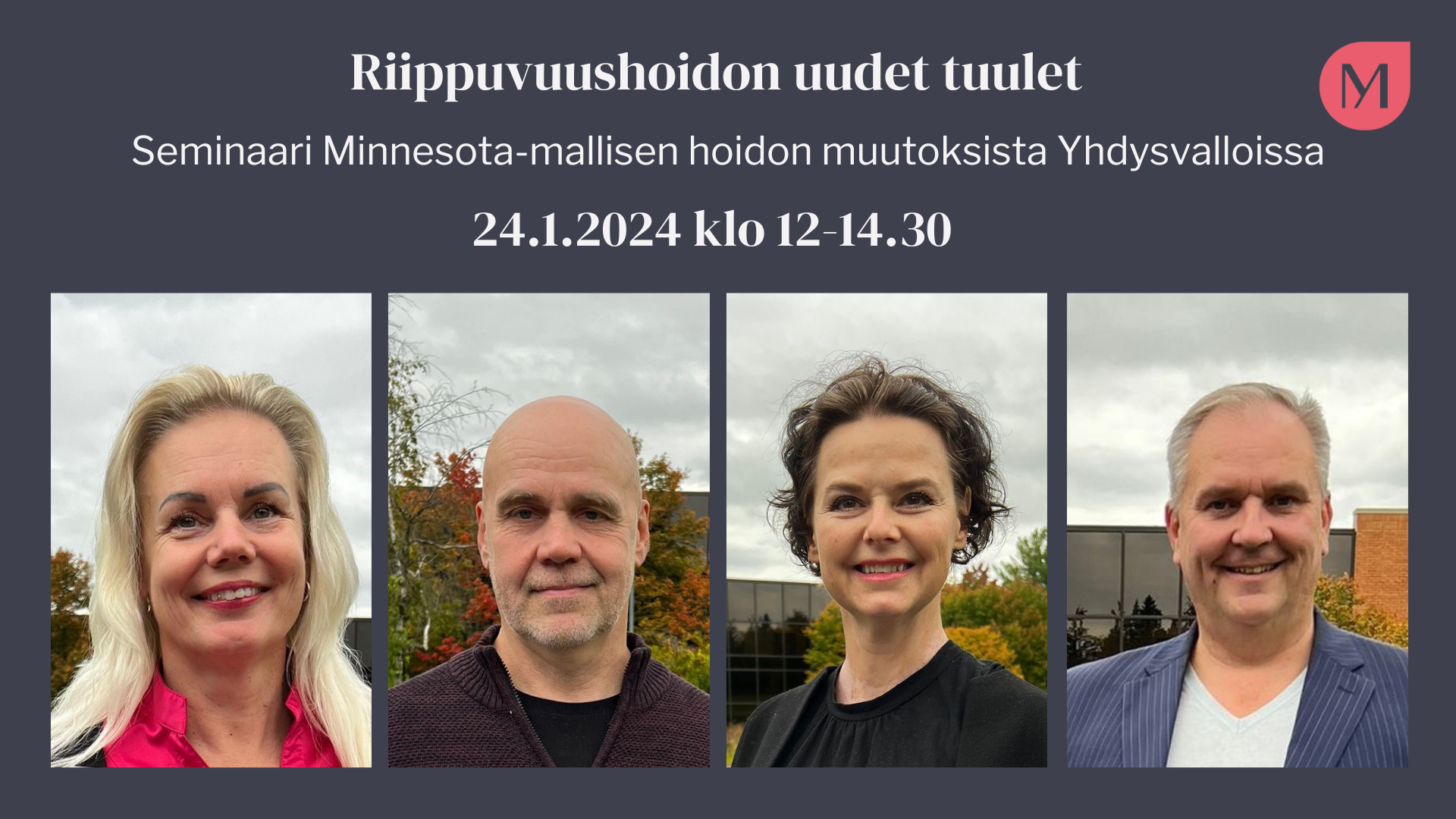 Riippuvuuksien asiantuntijajärjestö Myllyhoitoyhdistys järjestää seminaarin päihdehoidosta Yhdysvalloissa 24.1.2024. Tarkempana aiheena on riippuvuushoidon nykytilanne ja muutokset arvostetussa Hazelden Betty Ford Foundationin päihdehoitolaitoksessa. Laitosta pidetään Suomessakin laajasti toimivan Minnesota-mallisen päihdehoidon ja Myllyhoidon alkulähteenä.
