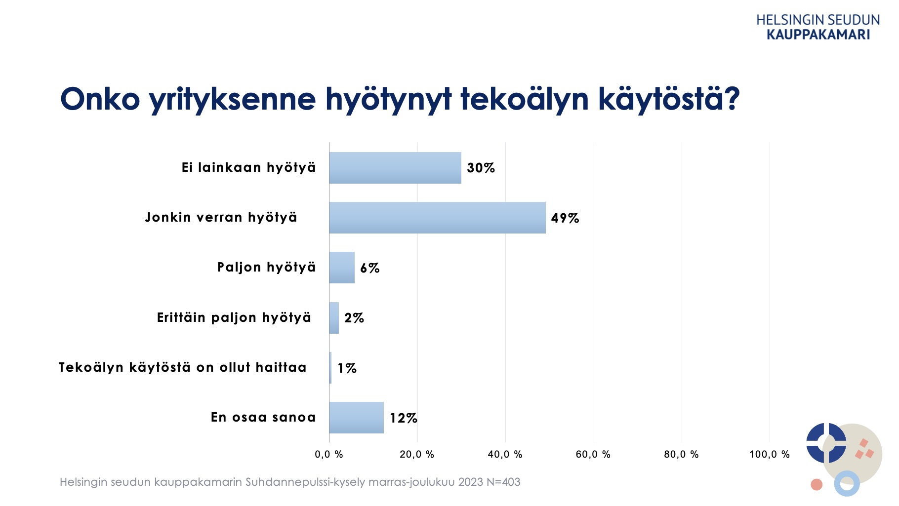 30 prosenttia Helsingin seudun yrityksistä toteaa, ettei tekoälyn käytöstä ole ollut lainkaan hyötyä ja prosentin mielestä siitä on ollut jopa haittaa. Ainoastaan 12 prosenttia ei osaa sanoa kantaansa tekoälyn hyödyllisyyteen omassa yrityksessä.