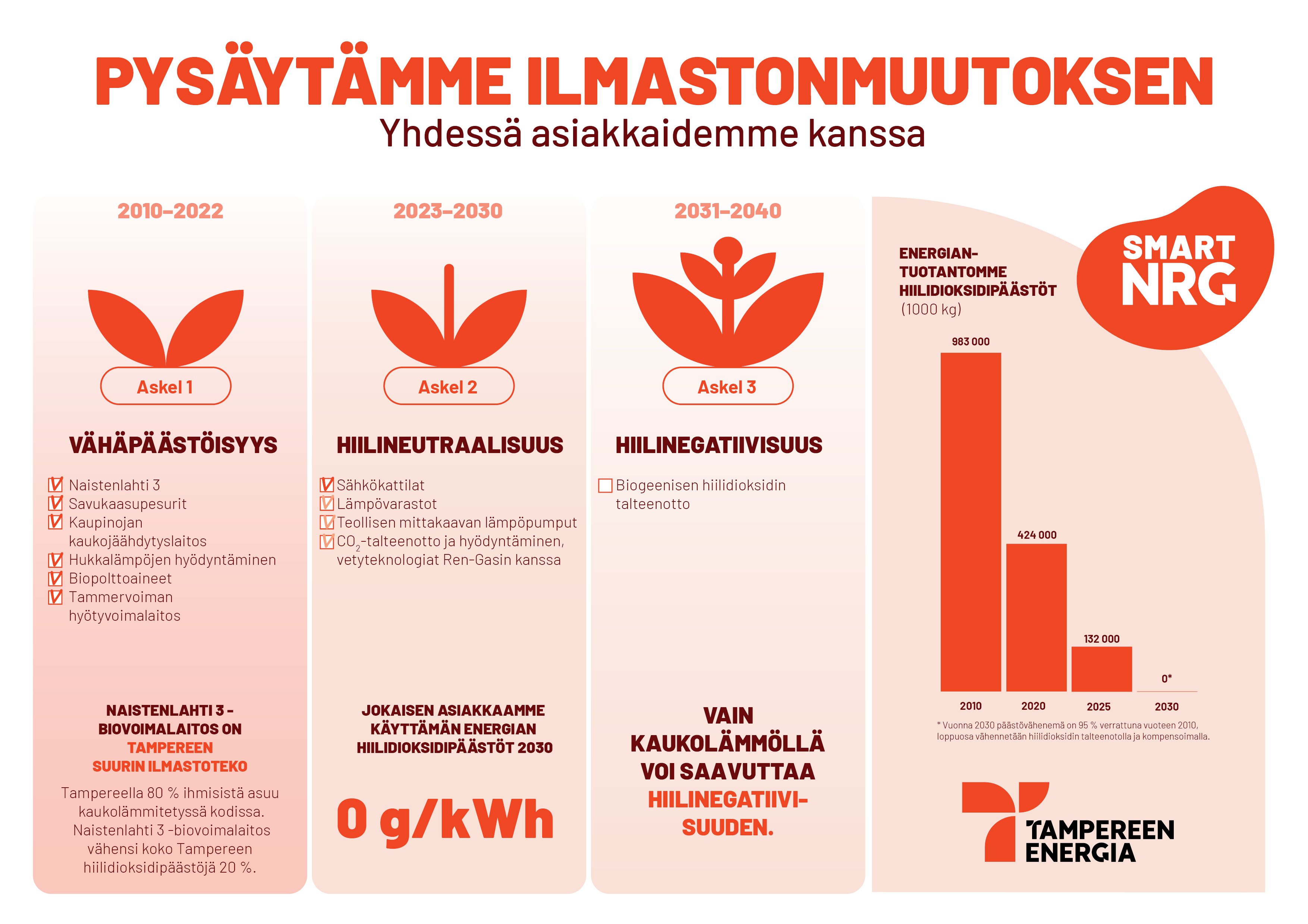 Tampereen Energian ilmastotiekartan mukaan kaikki yhtiön tuottama energia on hiilineutraalia vuoteen 2030 mennessä ja hiilinegatiivista vuoteen 2040 mennessä. Kaukolämpö on ainoa tulevaisuudessa hiilinegatiivinen lämmitysmuoto.