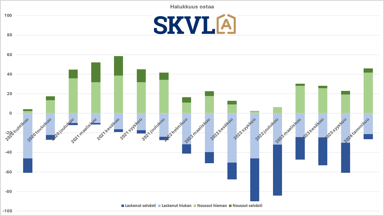 Suomen asuntomarkkinat ovat kääntyneet nopeasti ostajien kiinnostuksen noustua voimakkaasti. ”SKVL:n ostoaikomusmittarissa nähtiin koko mittaushistorian suurin käänne vuodenvaihteessa”, korostaa SKVL:n toimitusjohtaja Mannerberg. ”Myös myyntihalukkuudessa on nähty selvä käänne ylöspäin”, hän jatkaa.