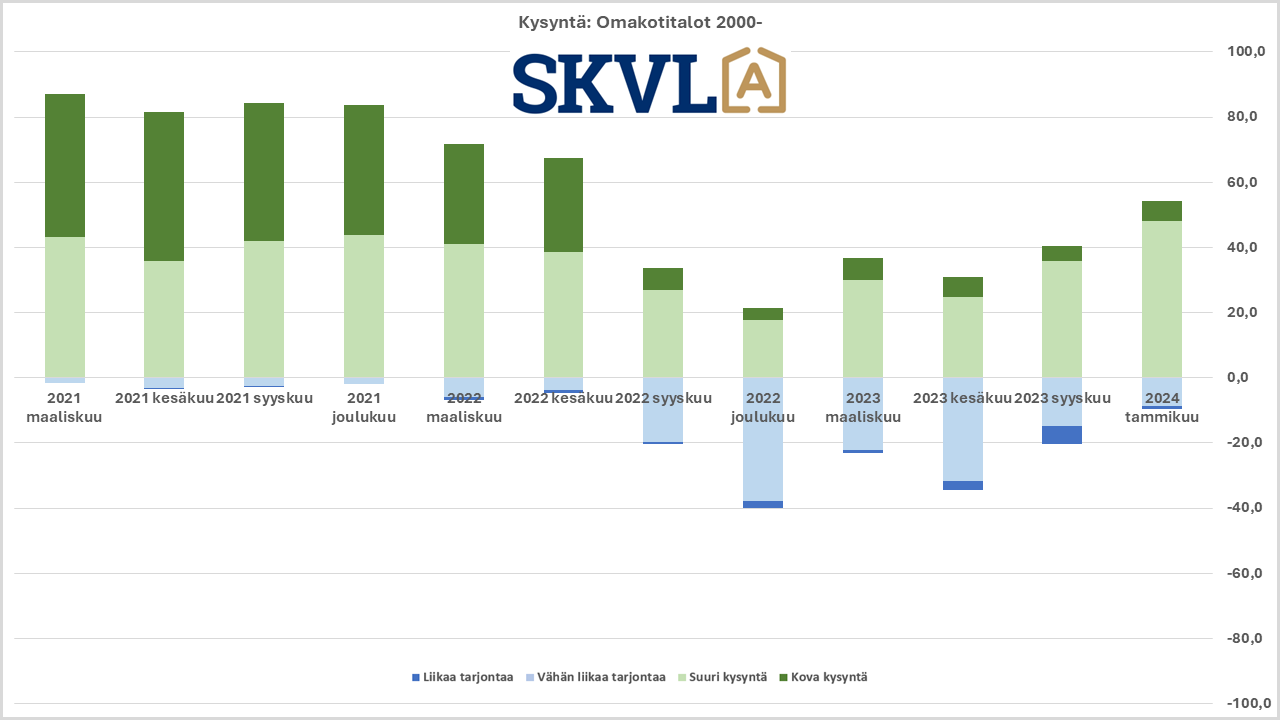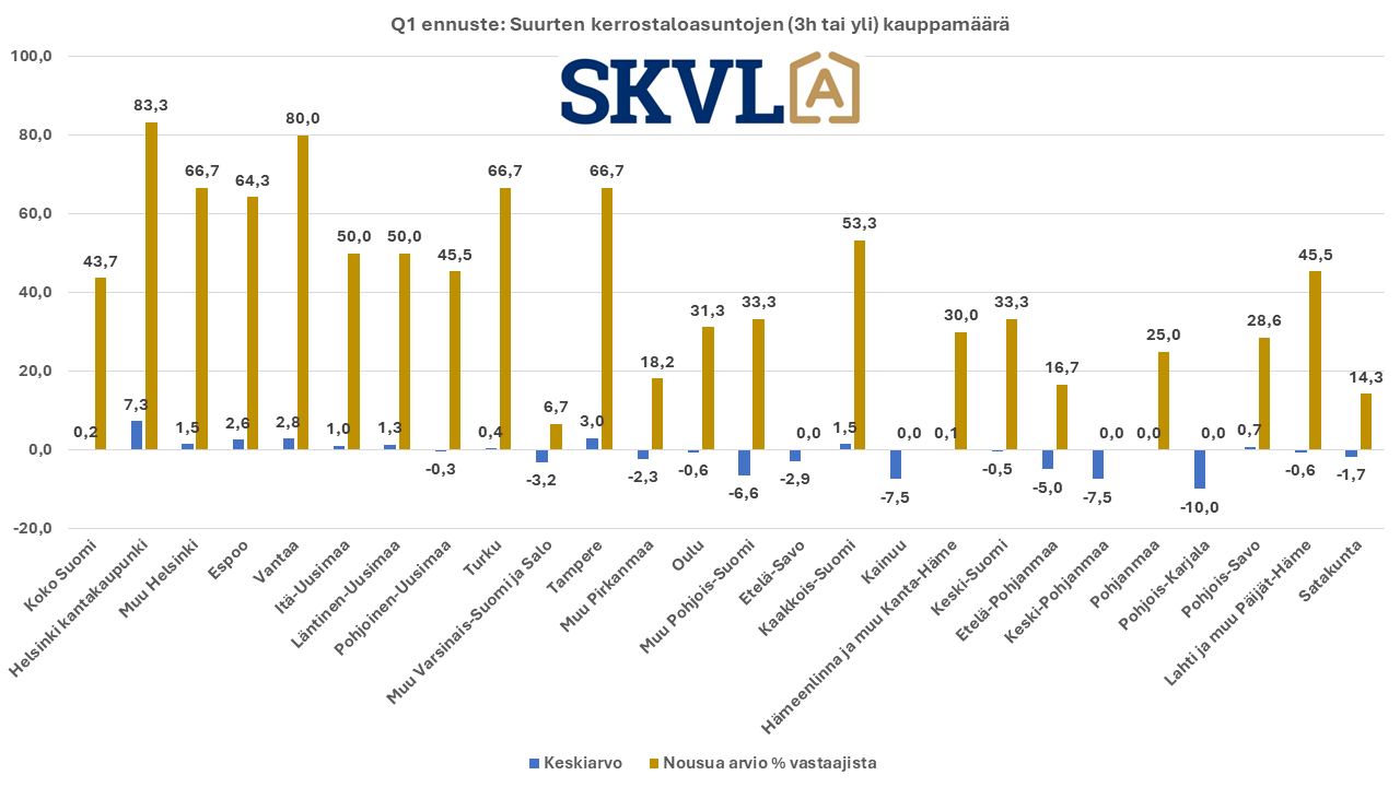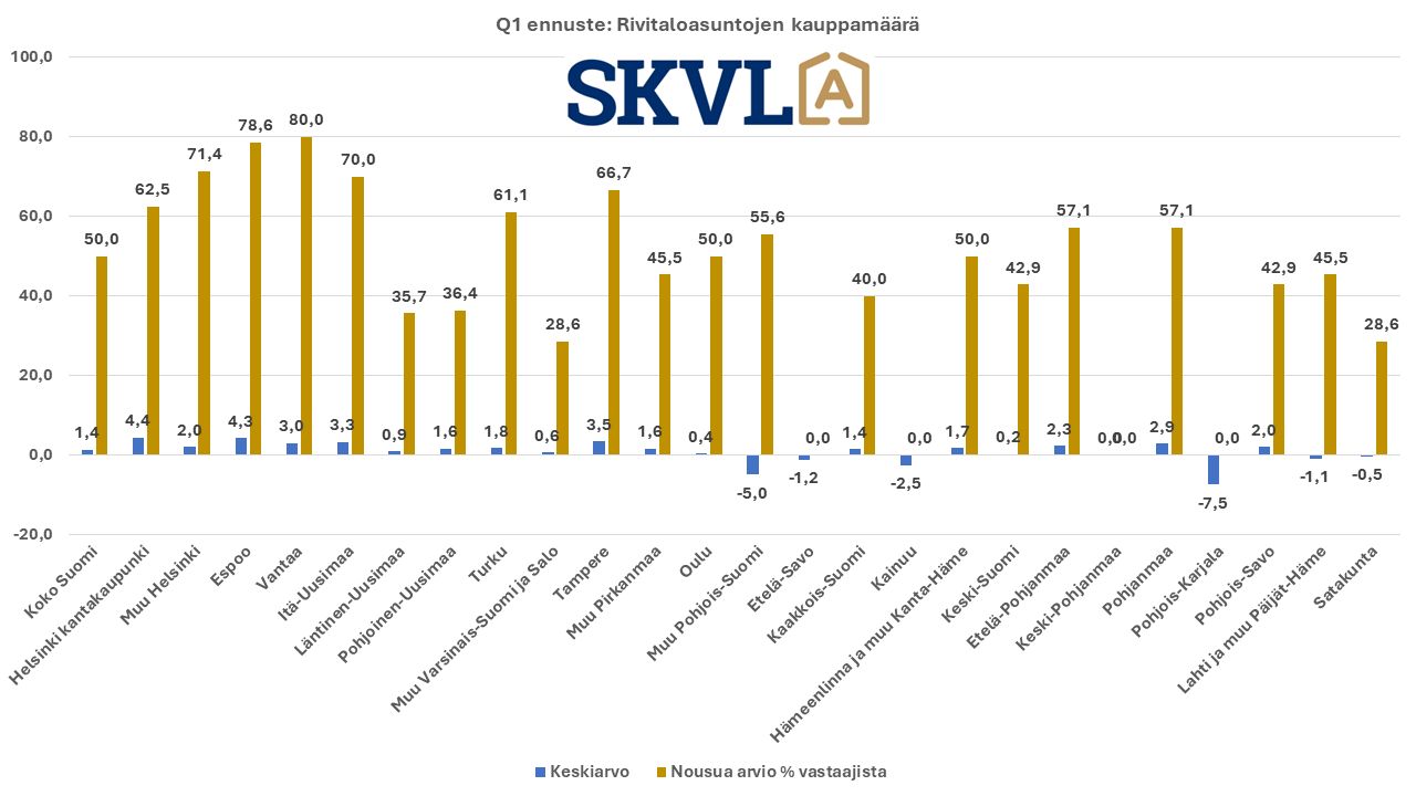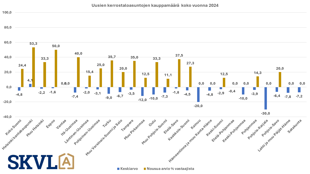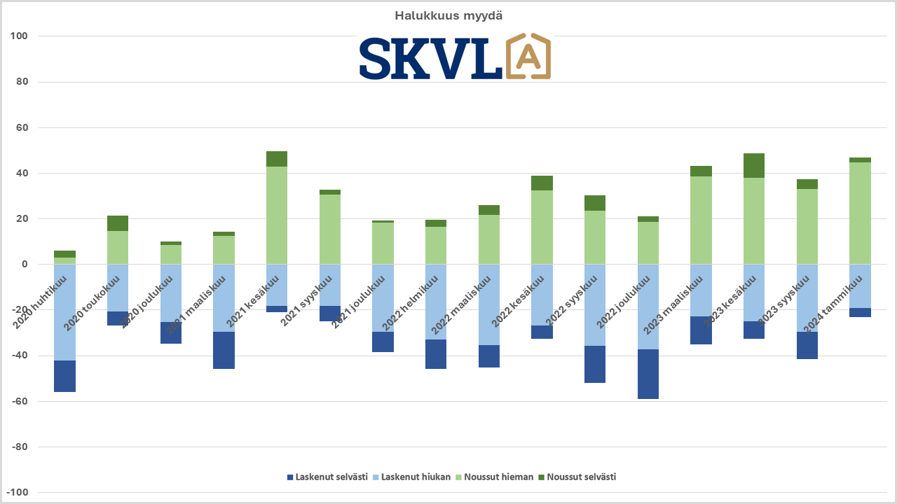 SKVL:n jäsenkunnan ammattilaisten tekemässä ennusteessa arvioidaan, että verrattuna vuoden 2023 lopun voimakkaaseen viimeiseen neljännekseen alkuvuosi 2024 tulee olemaan edelleen kasvun aikaa. Asuntojen hinnoissa ei vielä odoteta selvää nousua, mutta ei myöskään laskua. ”Nyt alkaa yli vuoden kestänyt markkinoiden suma purkautua järkevällä vauhdilla”, kommentoi SKVL:n toimitusjohtaja Jussi Mannerberg. ”Ennusteessamme näkyy nyt erityisesti perheasuntojen kysynnän jatkuva nousu”, hän jatkaa.