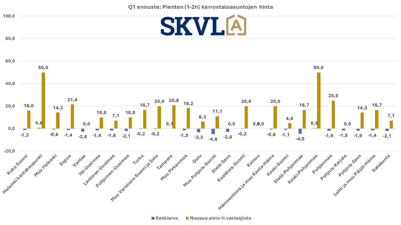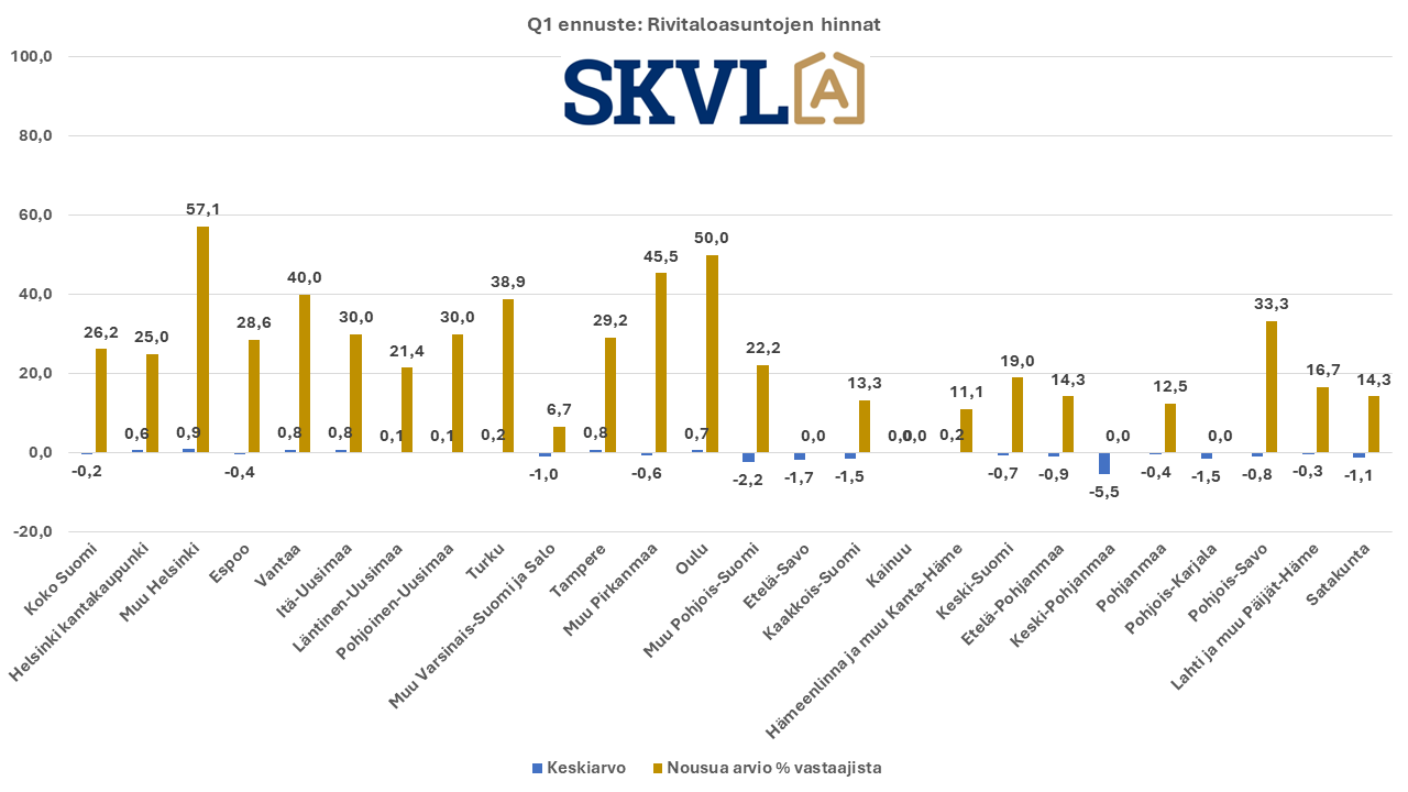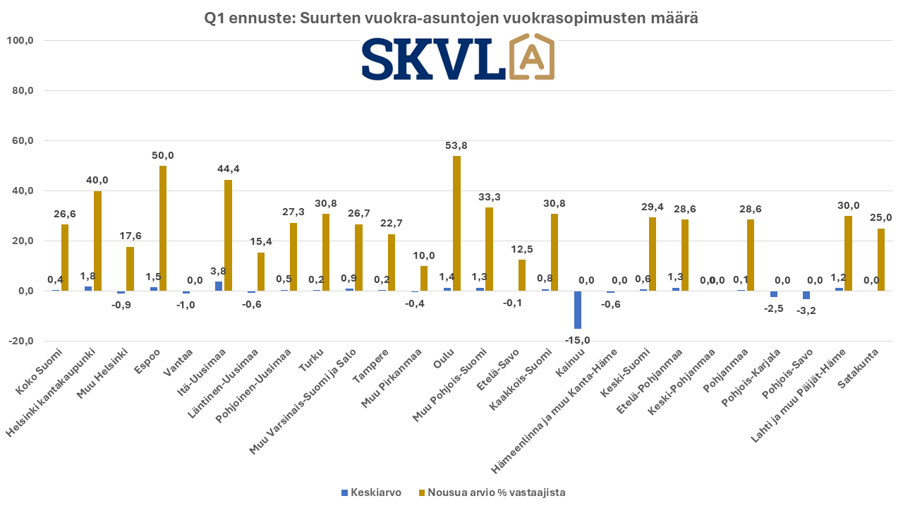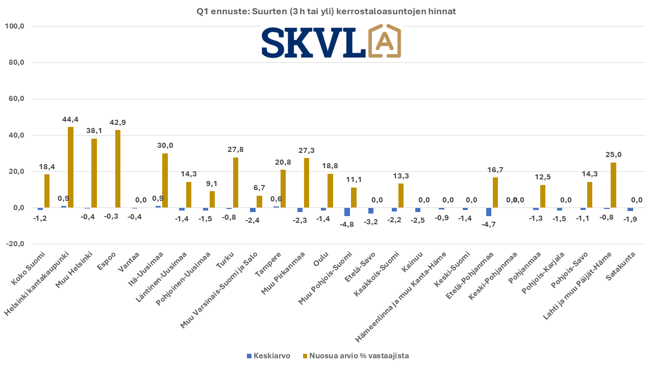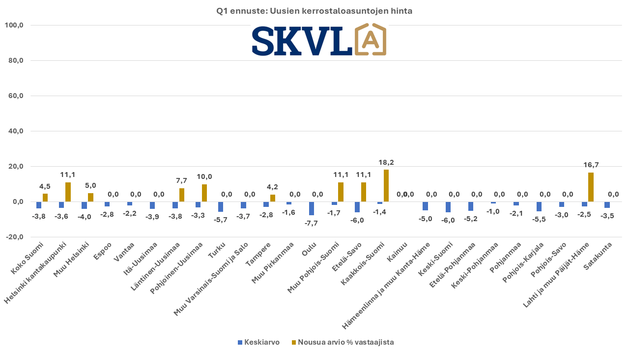 SKVL:n jäsenkunnan ammattilaisten tekemässä ennusteessa arvioidaan, että verrattuna vuoden 2023 lopun voimakkaaseen viimeiseen neljännekseen alkuvuosi 2024 tulee olemaan edelleen kasvun aikaa. Asuntojen hinnoissa ei vielä odoteta selvää nousua, mutta ei myöskään laskua. ”Nyt alkaa yli vuoden kestänyt markkinoiden suma purkautua järkevällä vauhdilla”, kommentoi SKVL:n toimitusjohtaja Jussi Mannerberg. ”Ennusteessamme näkyy nyt erityisesti perheasuntojen kysynnän jatkuva nousu”, hän jatkaa.